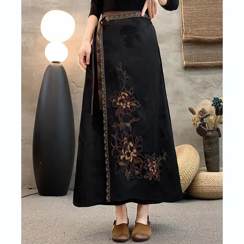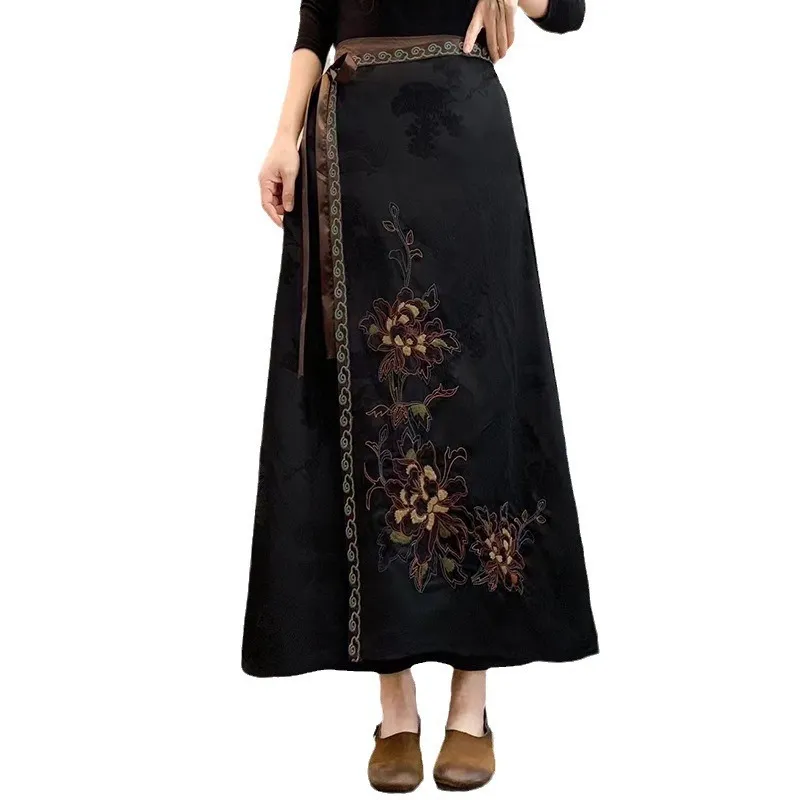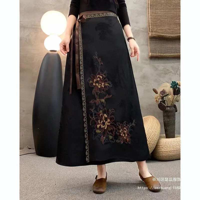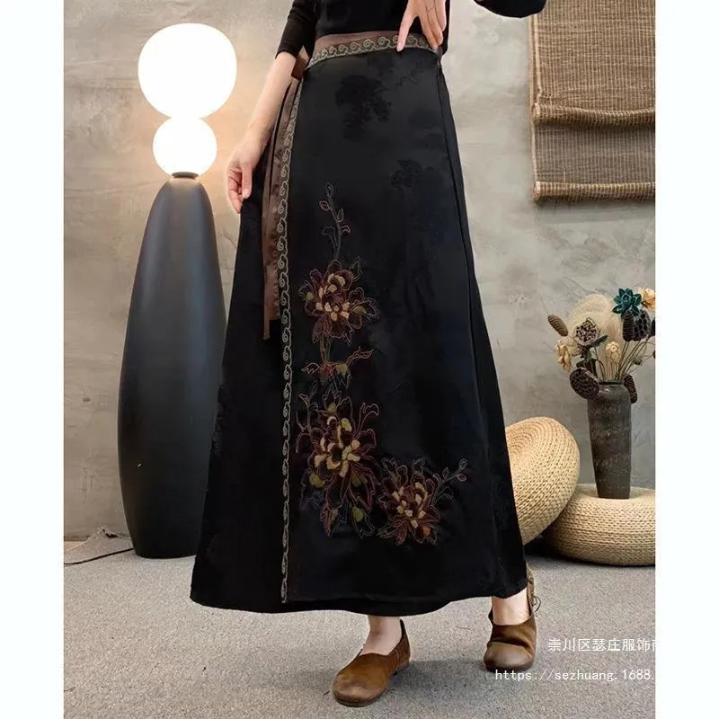 衣都精品- 2023新款緞面刺繡鬆緊腰大碼顯瘦繫帶半身裙