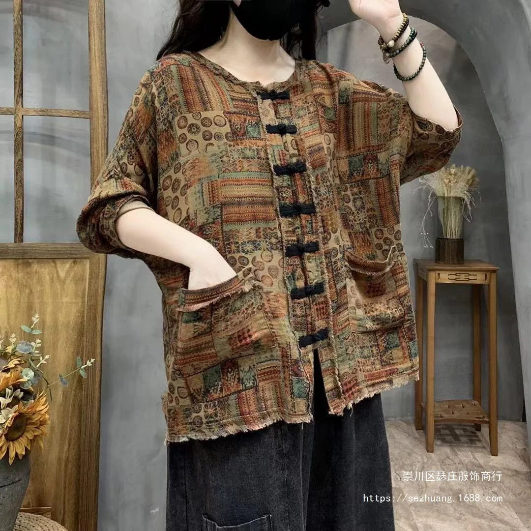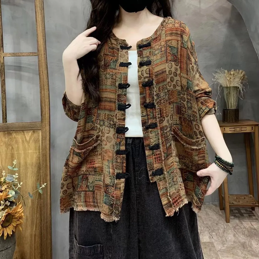 衣都精品- 2023新款民族風寬鬆休閒毛邊印花盤扣上衣