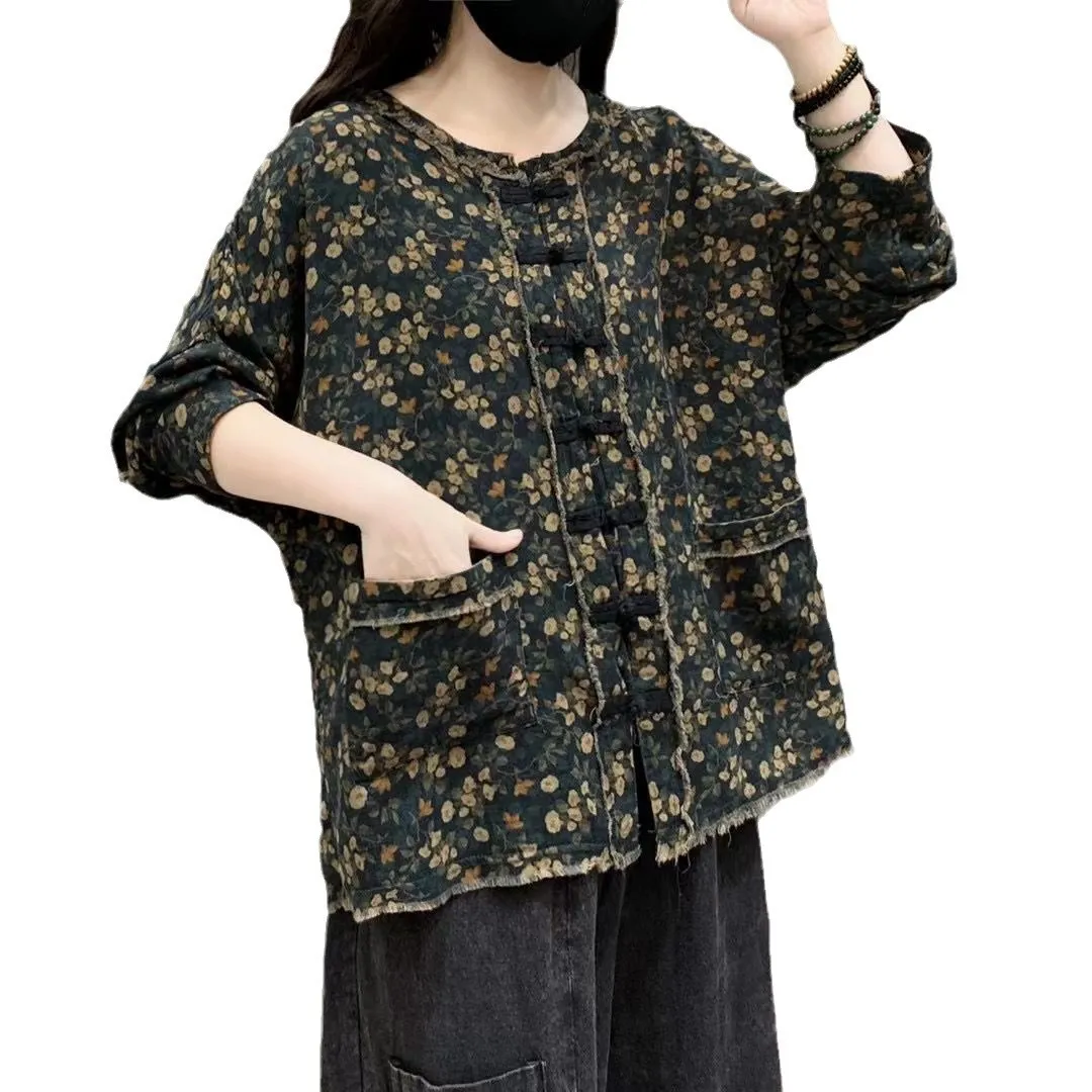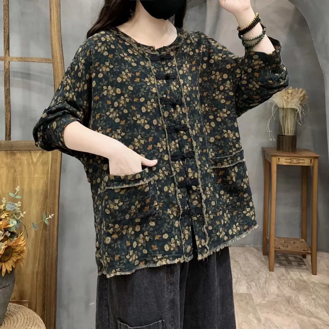 衣都精品- 2023新款民族風寬鬆休閒毛邊印花盤扣上衣