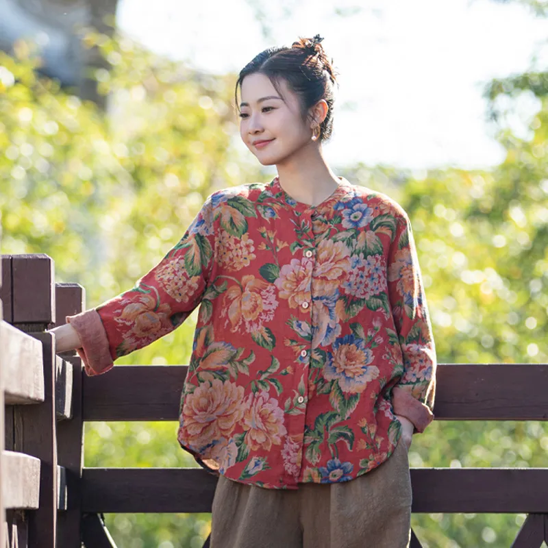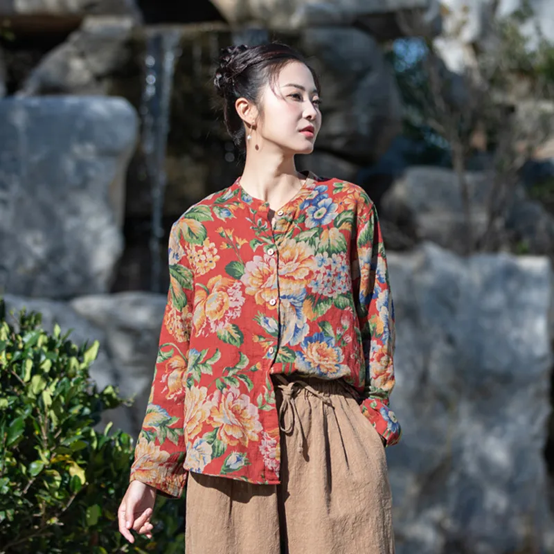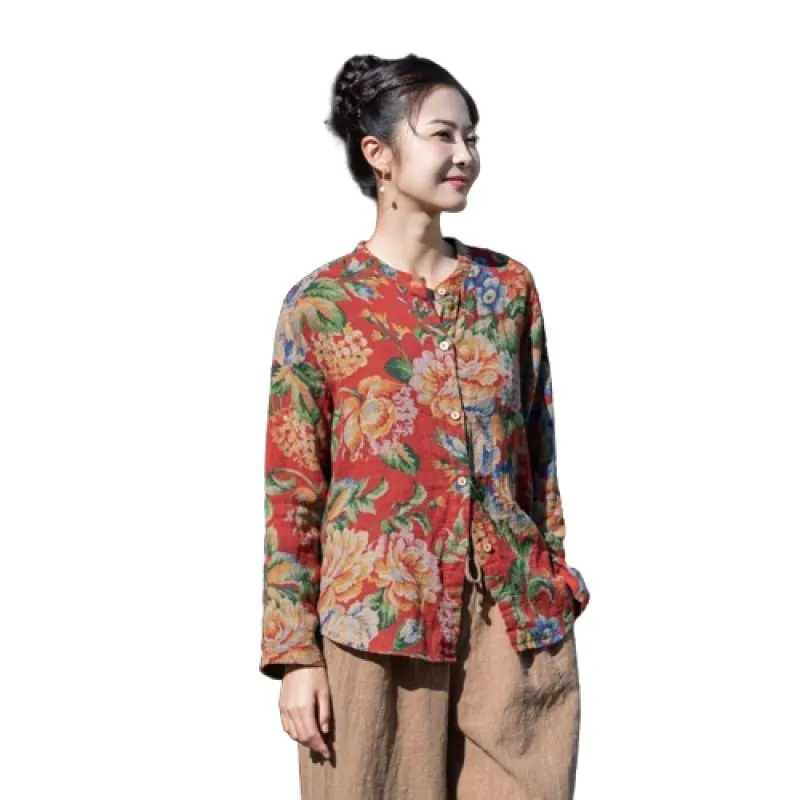 衣都精品- 2023新款民族風立領印花長袖大碼上衣