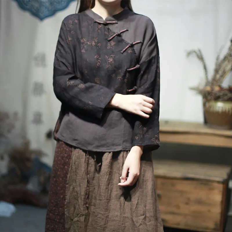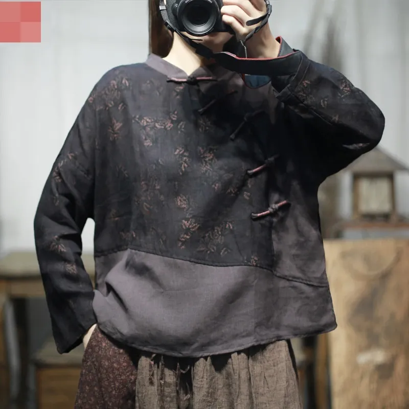 衣都精品- 2023新款復古仿香雲紗印花立領斜襟繞線盤扣上衣