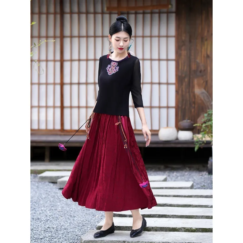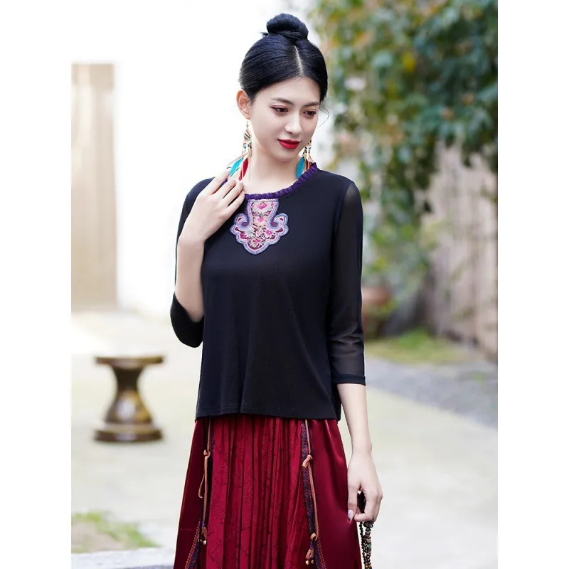 衣都精品- 2023新款民族風圓領刺繡百搭顯瘦內搭上衣