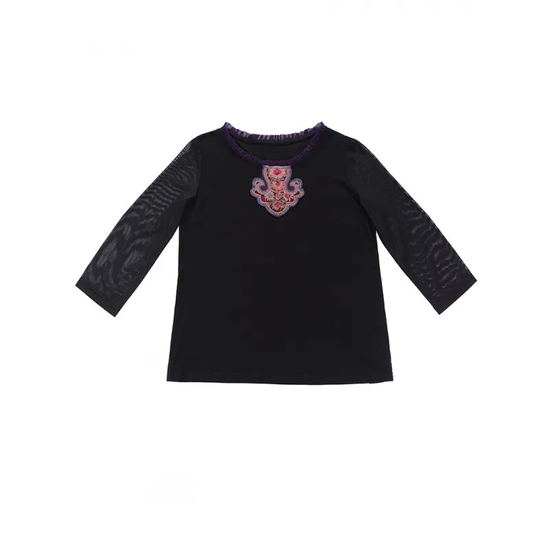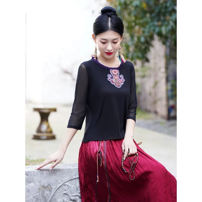 衣都精品- 2023新款民族風繡花網紗七分袖顯瘦上衣