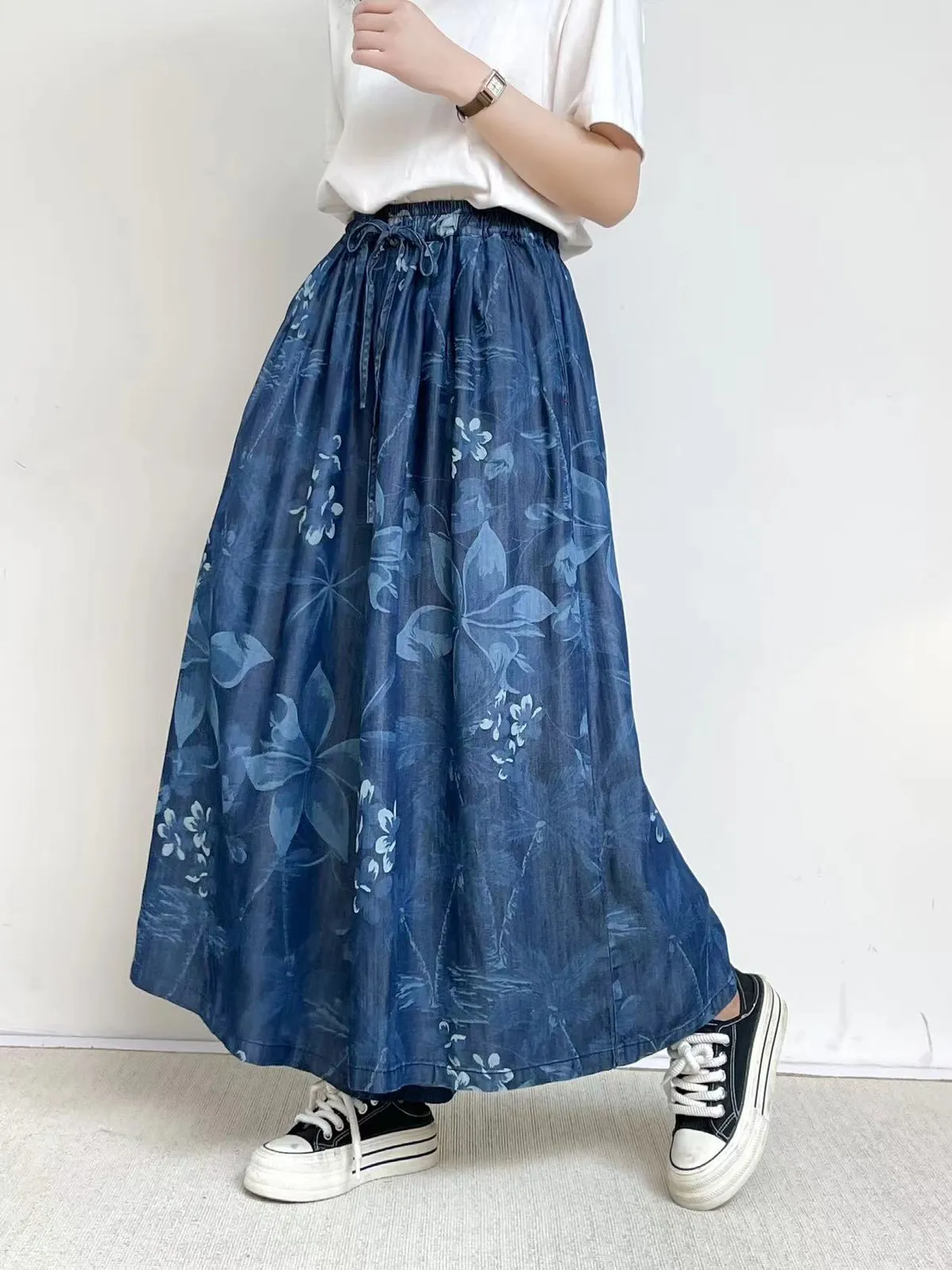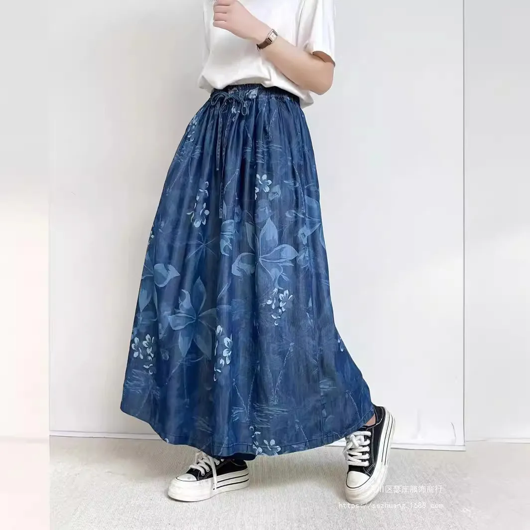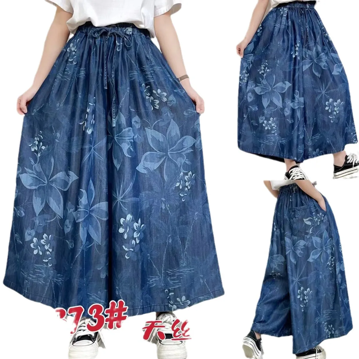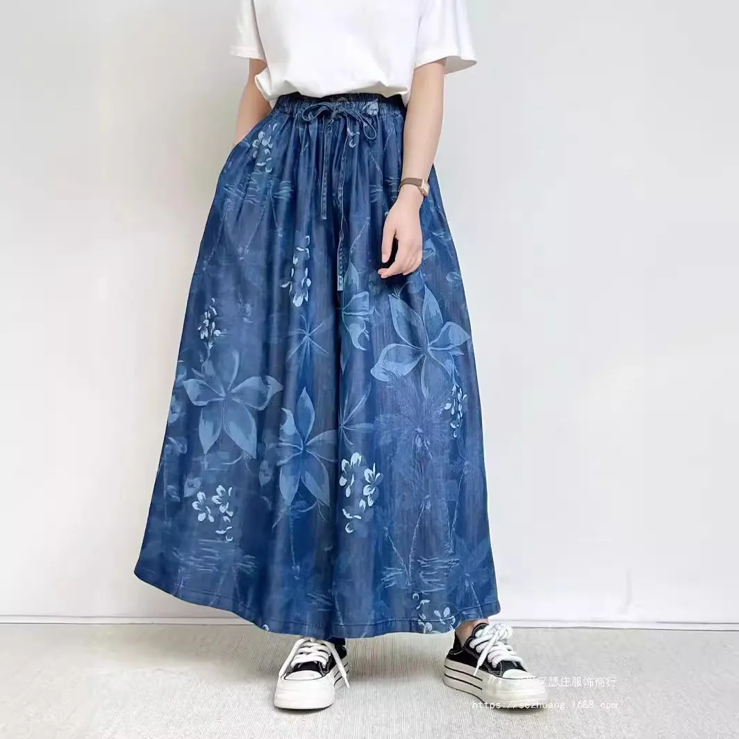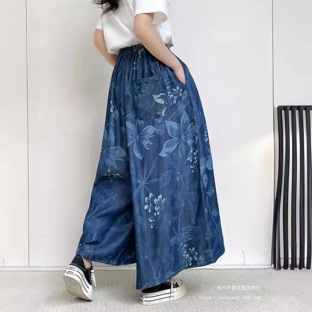 衣都精品- 2023新款印花鬆緊腰寬鬆休閒大擺闊腿褲