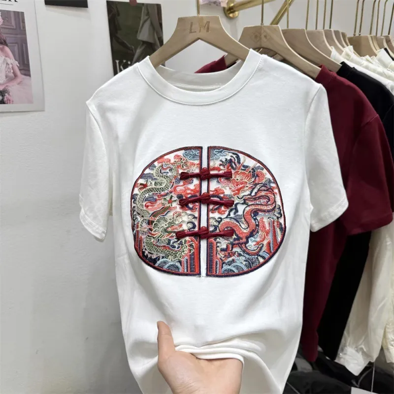 衣都精品- 2023新款中式復古刺繡短袖大碼顯瘦上衣