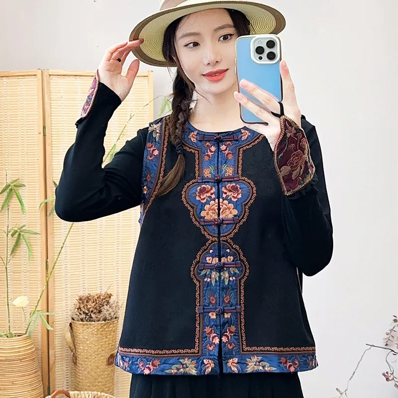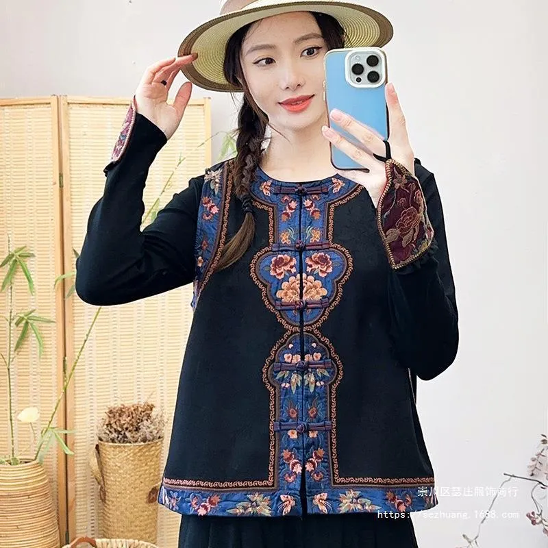 衣都精品- 2023新款民族風刺繡緞面提花盤扣馬甲外套