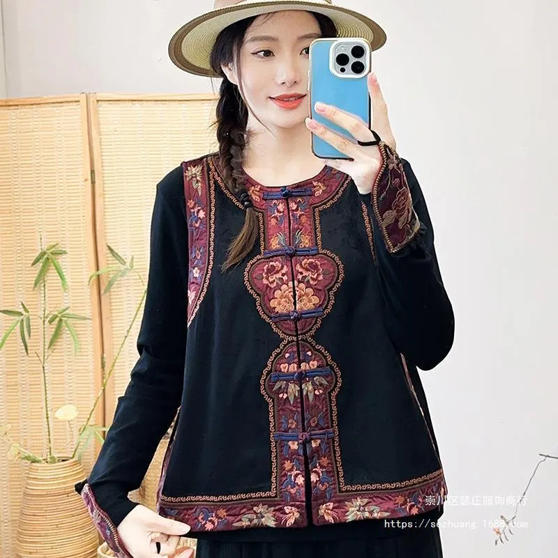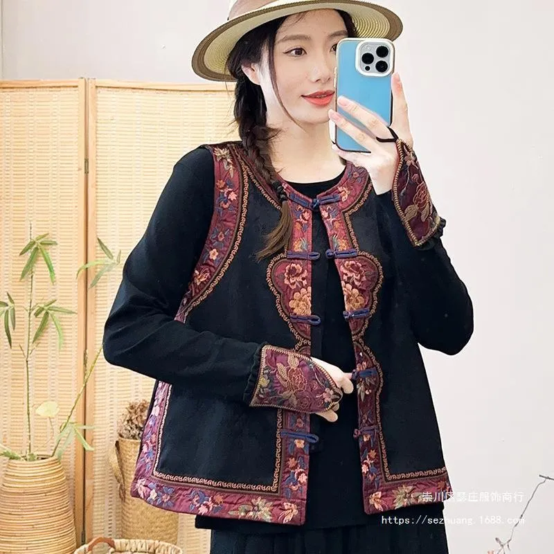 衣都精品- 2023新款民族風刺繡緞面提花盤扣馬甲外套
