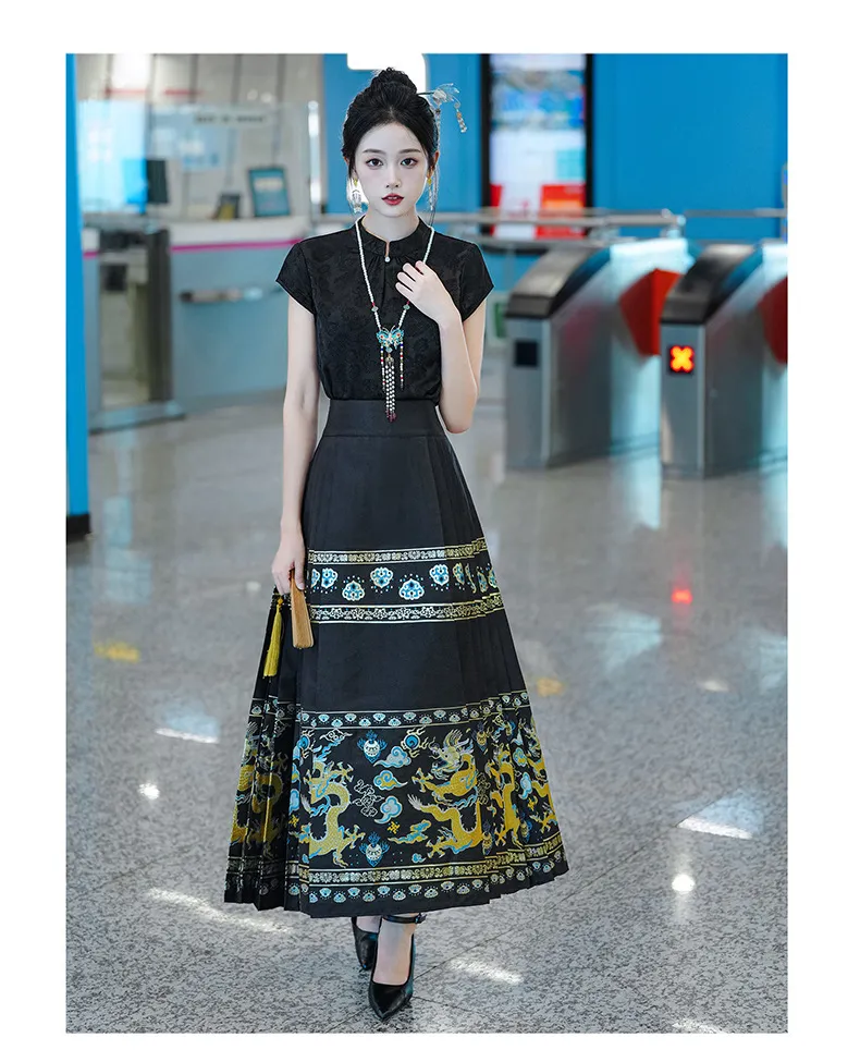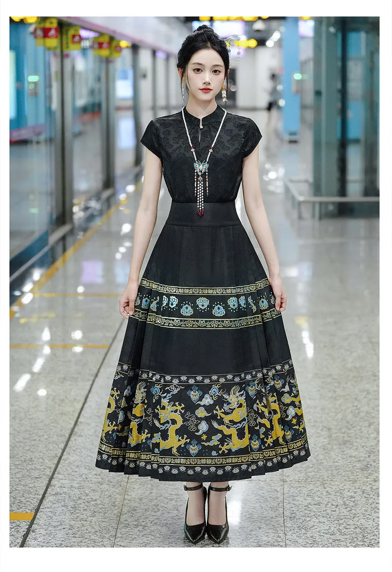 衣都精品- 2023新款一片式超大擺重工刺繡織金黑金龍馬面裙