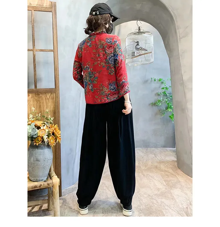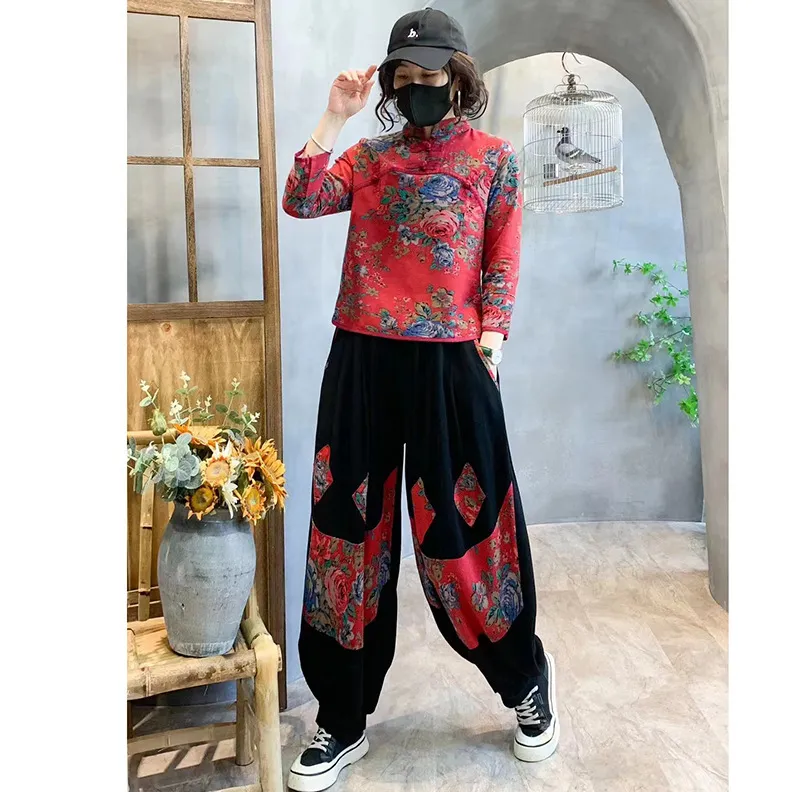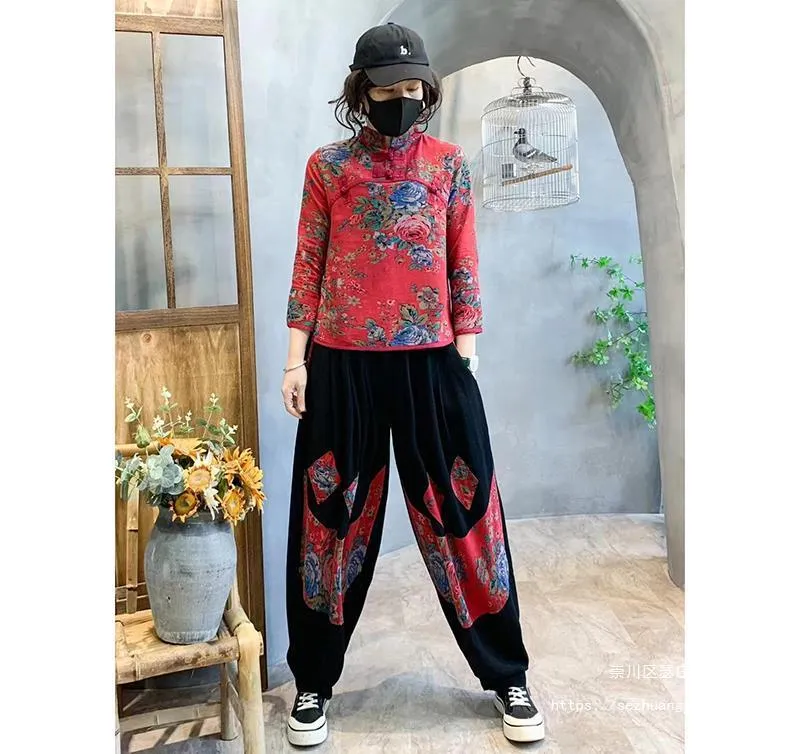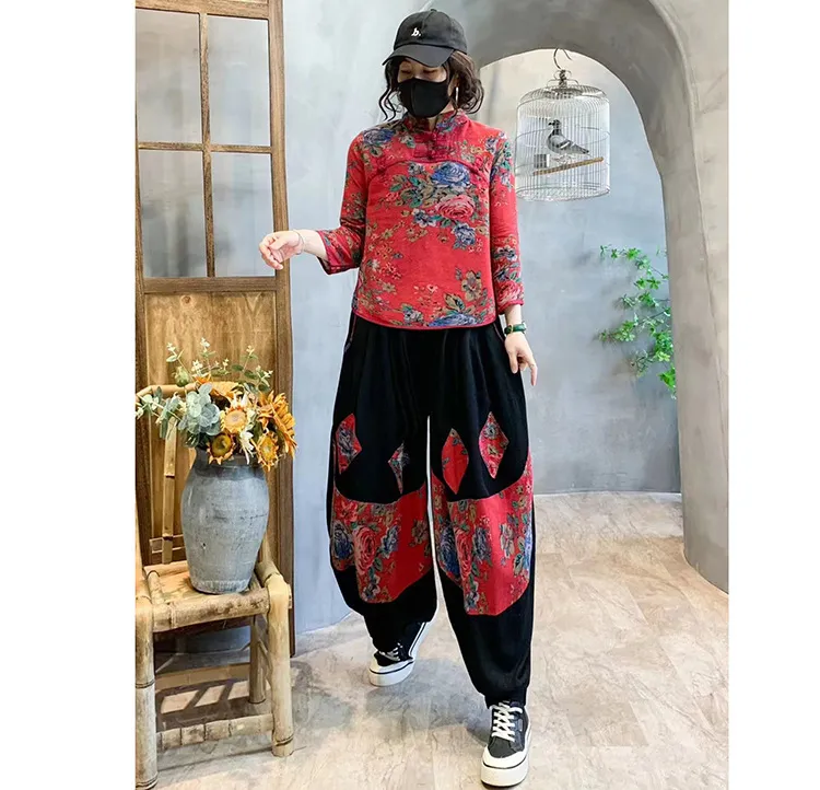 衣都精品- 2023新款復古印花上衣+高腰大碼燈籠褲民族風套裝