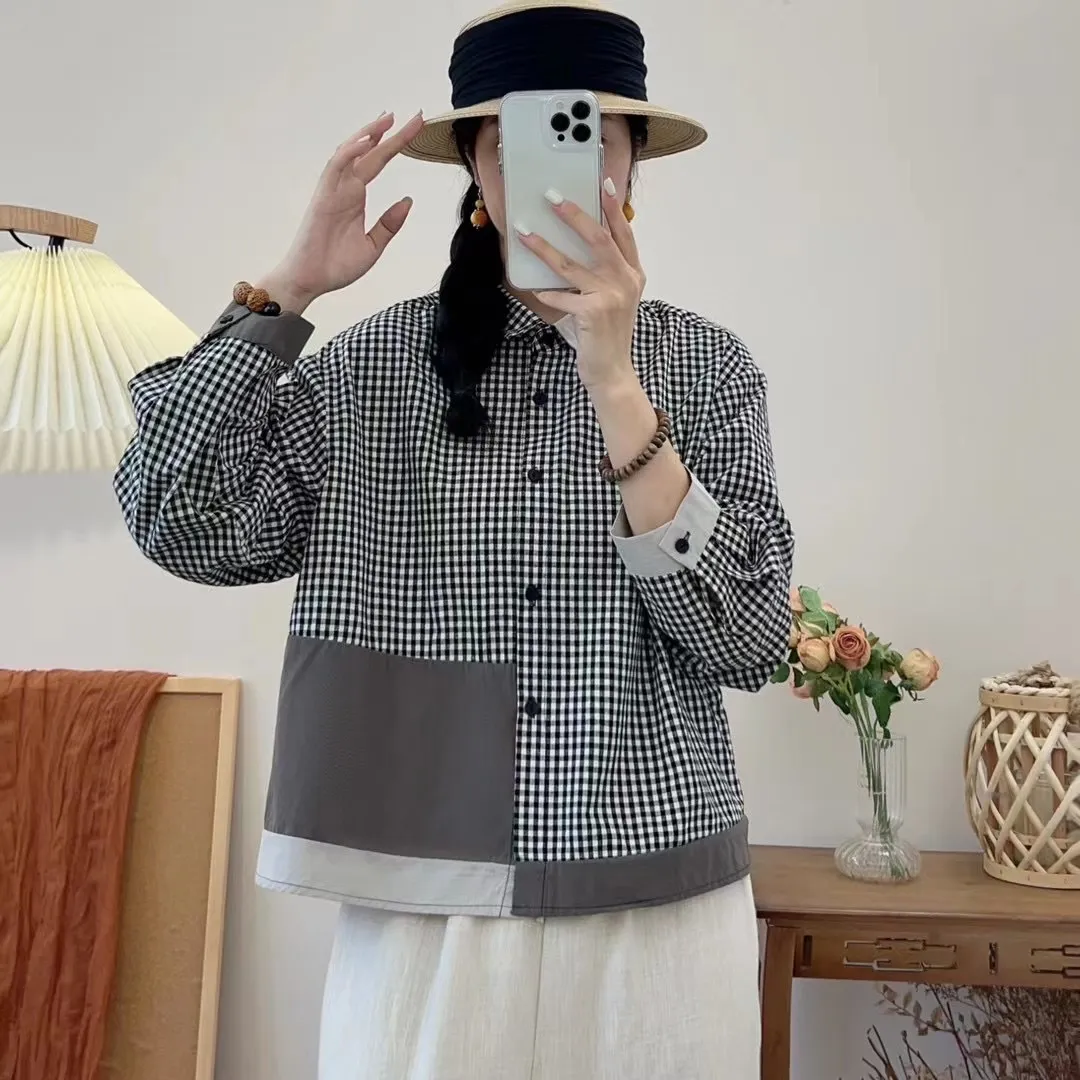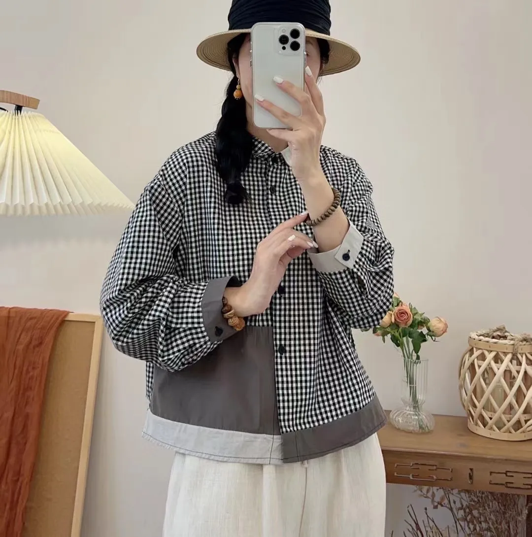衣都精品- 新款寬鬆翻領撞色拼接格紋上衣