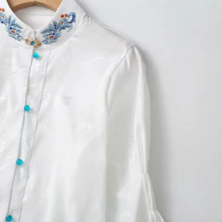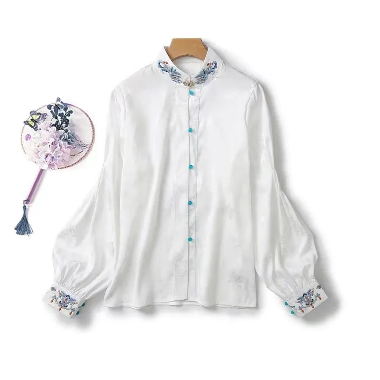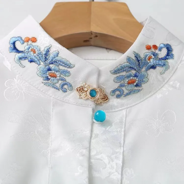 衣都精品- 新款白色中長款開襟領上刺繡上衣