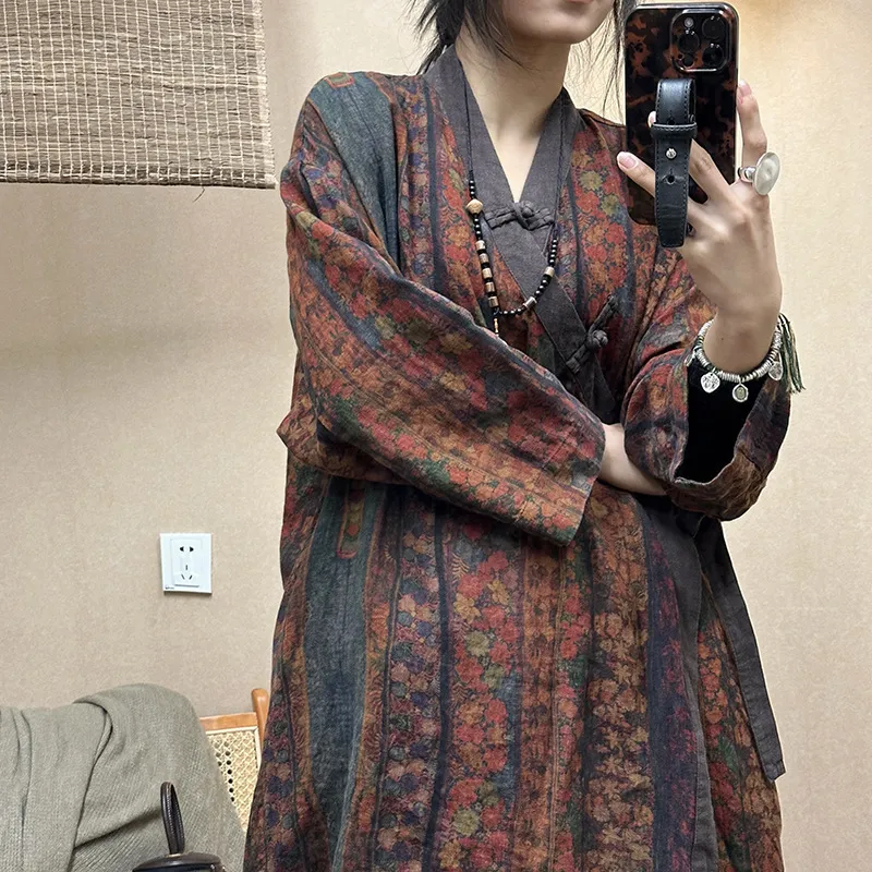 衣都精品- 新款大V領長袖袍子撞色拼接印花斜襟繫帶連衣裙