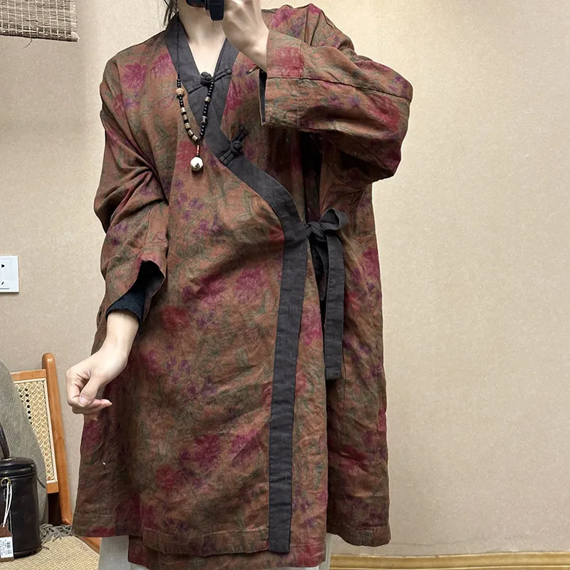 衣都精品- 新款大V領長袖袍子撞色拼接印花斜襟繫帶連衣裙