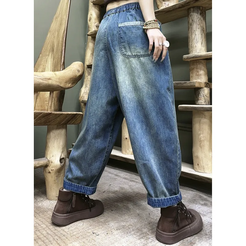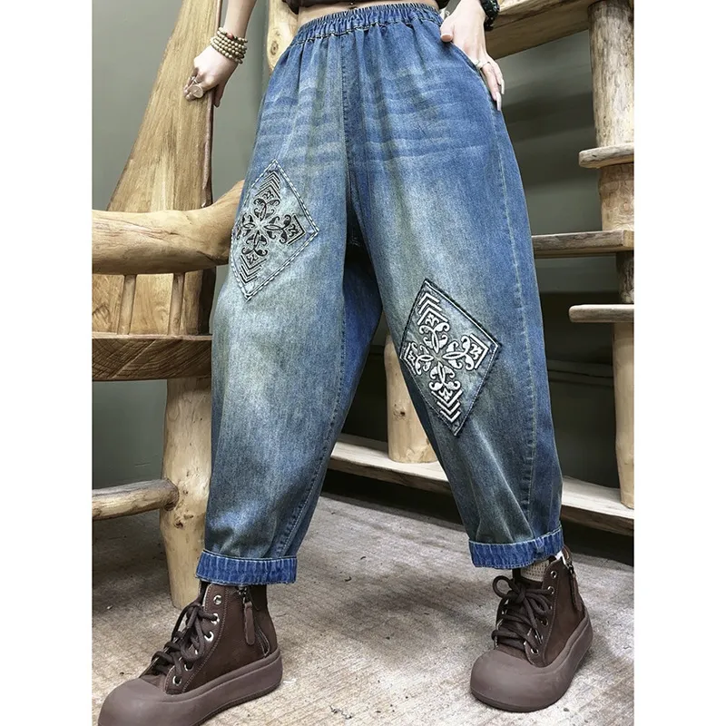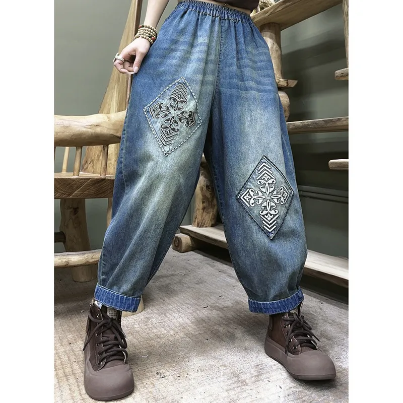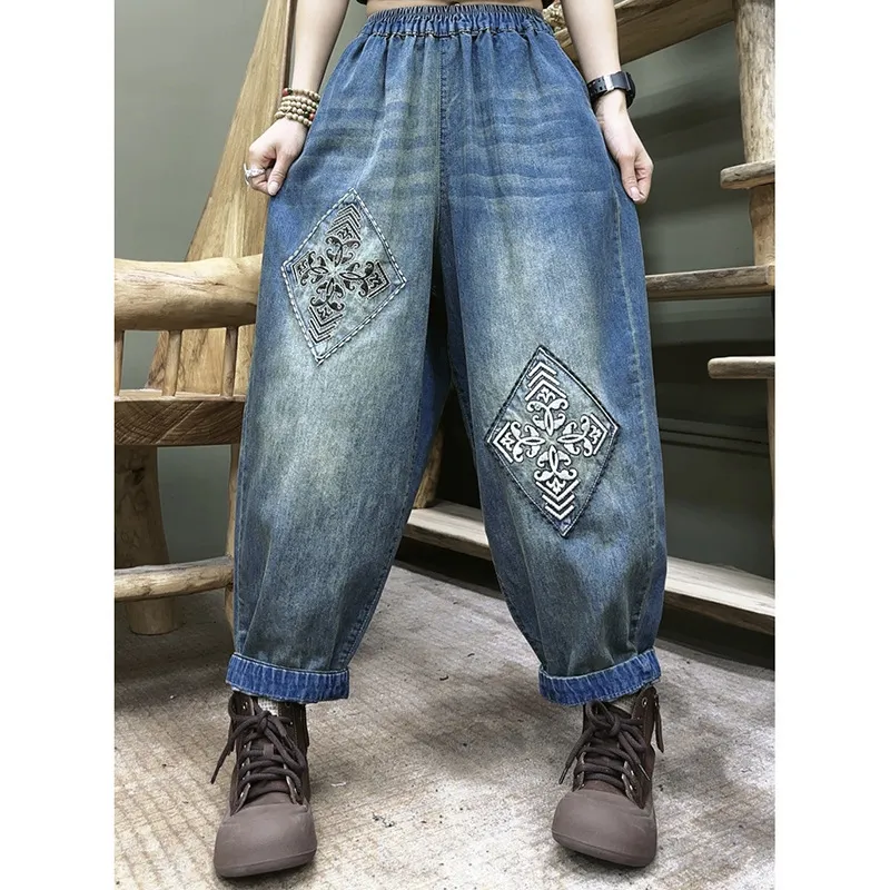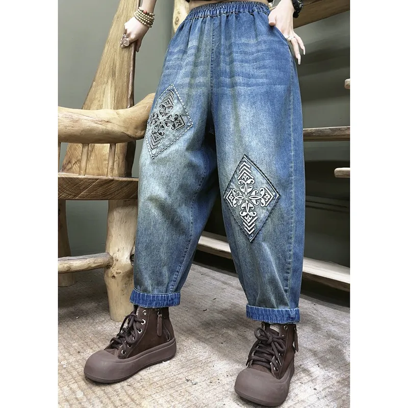 衣都精品- 新款韓版寬鬆刺繡水洗鬆緊腰大碼顯瘦哈倫褲