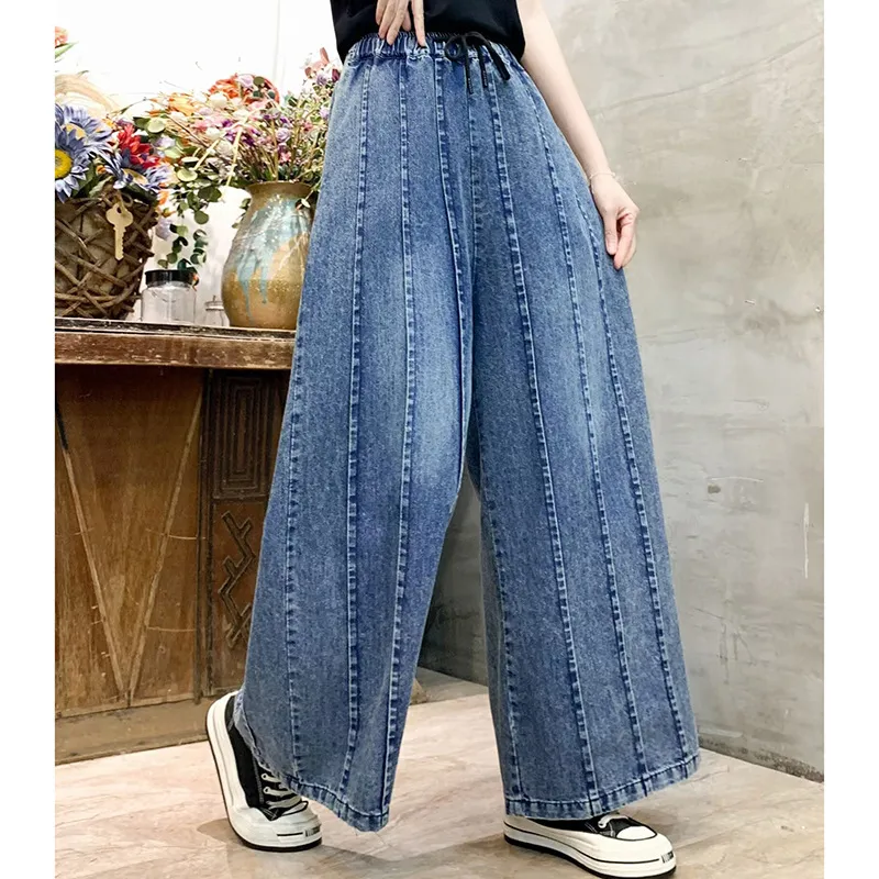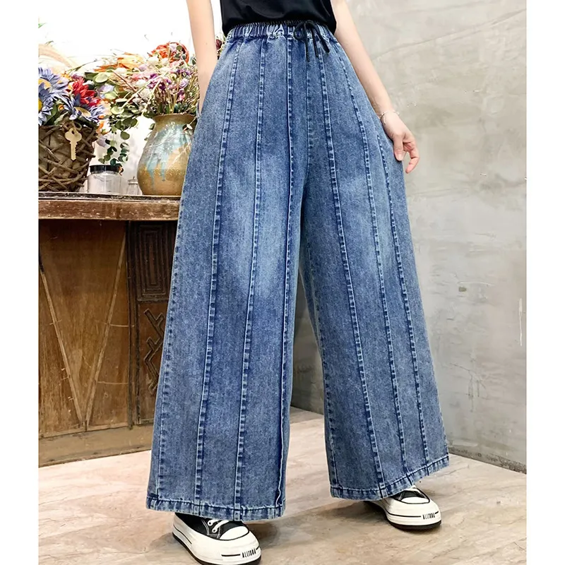衣都精品- 新款文藝拼接炒色做舊抽繩繫帶鬆緊腰直筒褲