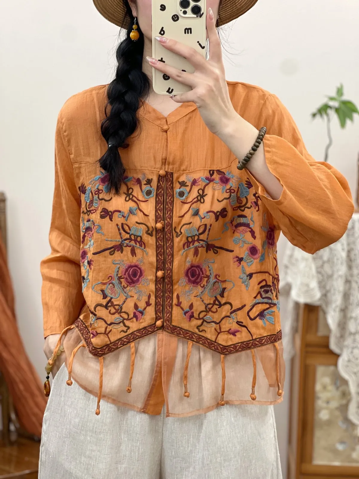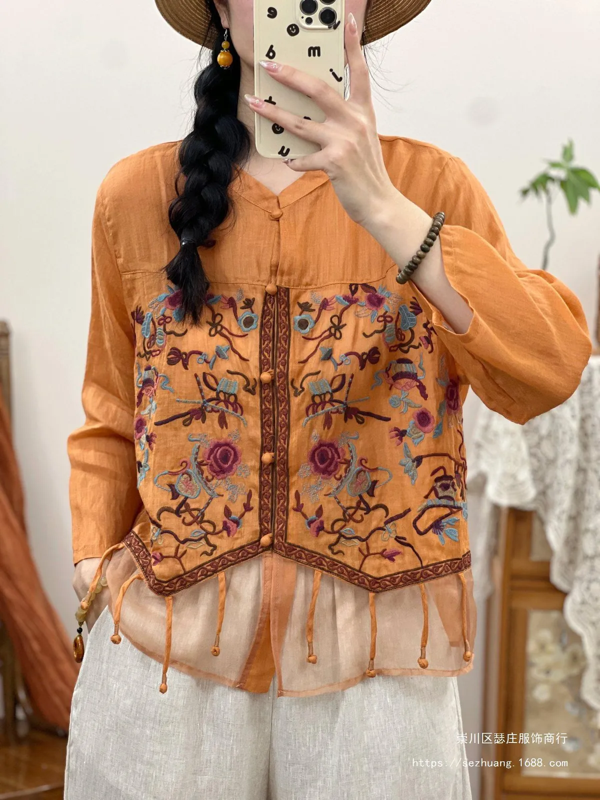 衣都精品- 新款民族風重工繡花包扣開襟歐根紗拼接上衣