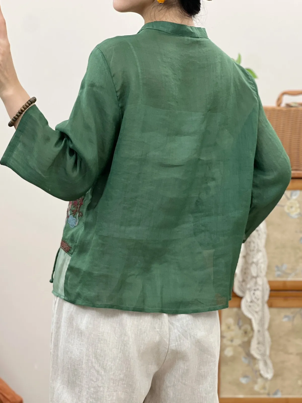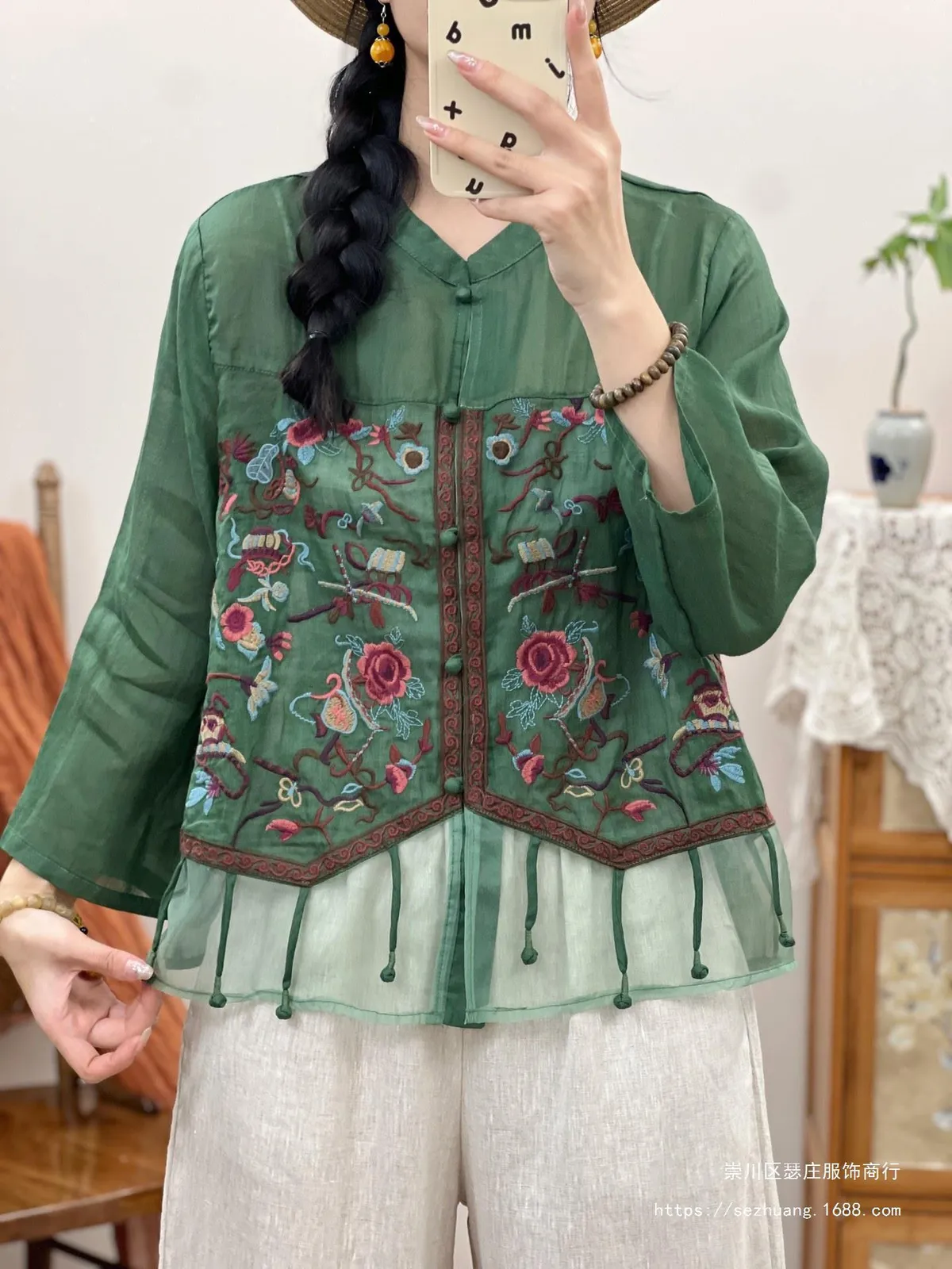 衣都精品- 新款民族風重工繡花包扣開襟歐根紗拼接上衣