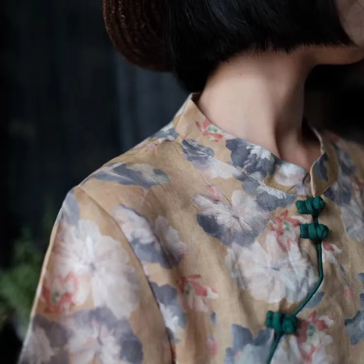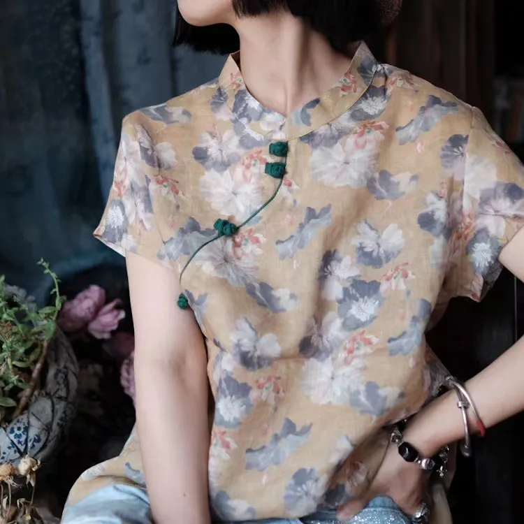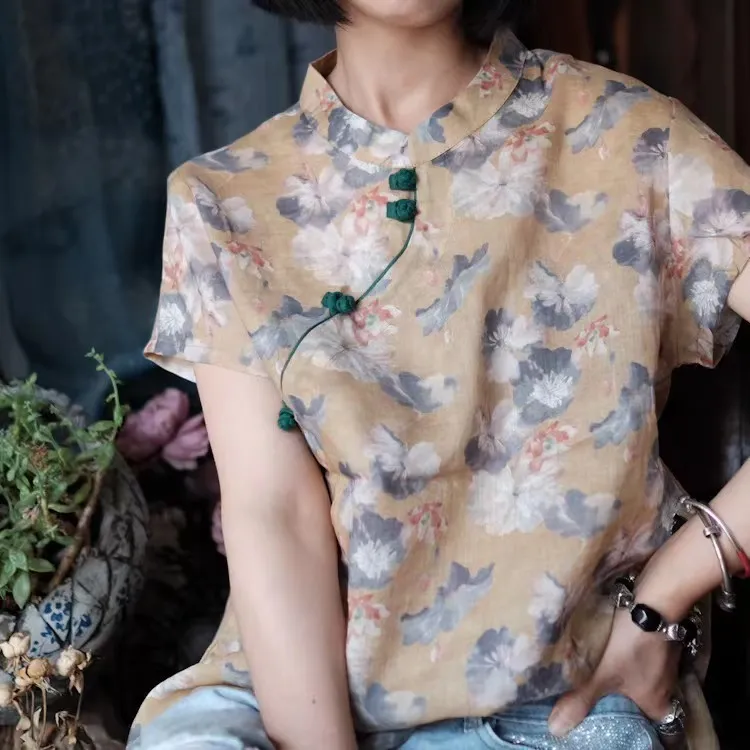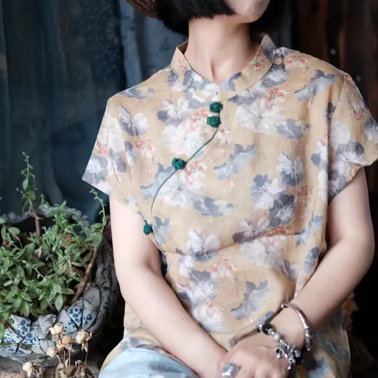 衣都精品- 新款立領盤扣數位印花短袖上衣
