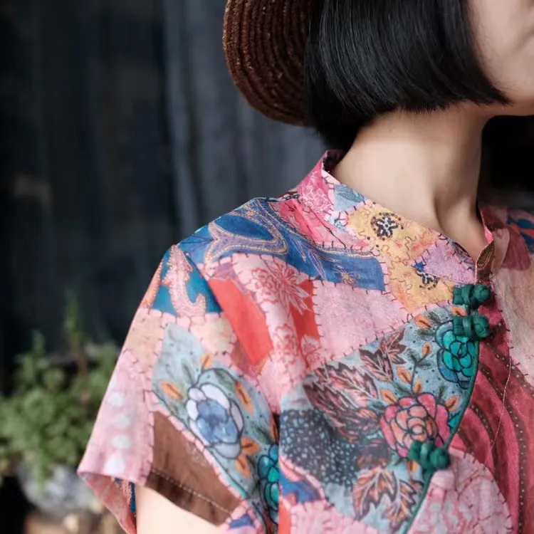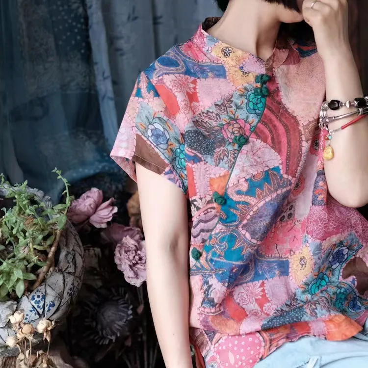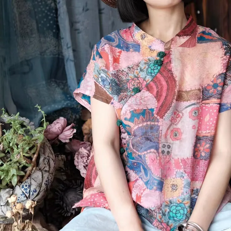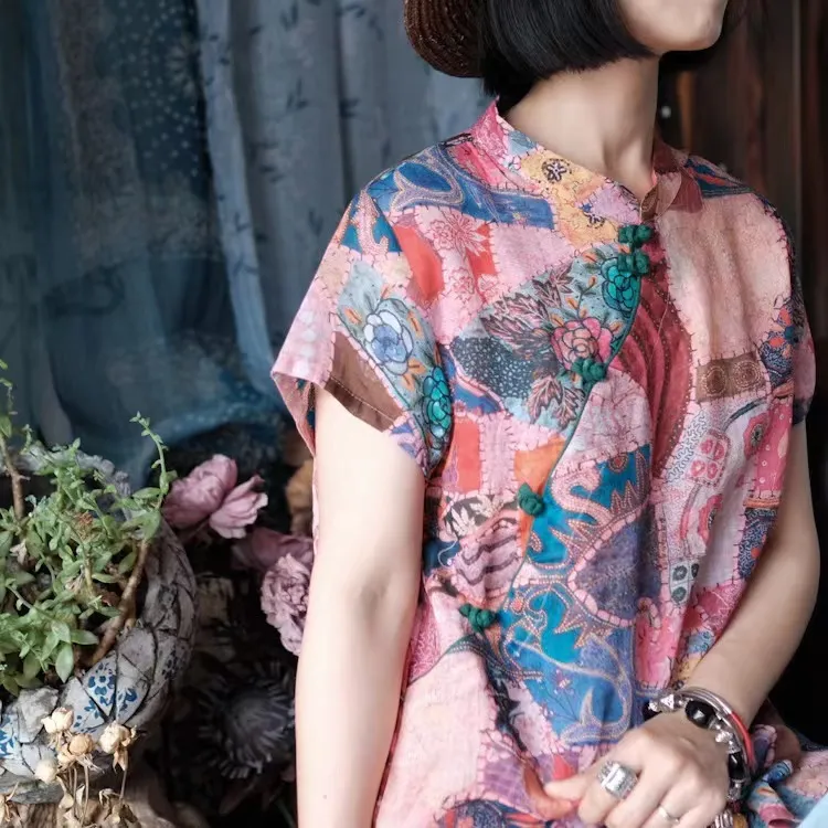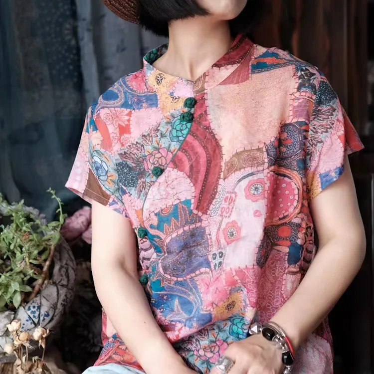 衣都精品- 新款立領盤扣數位印花短袖上衣
