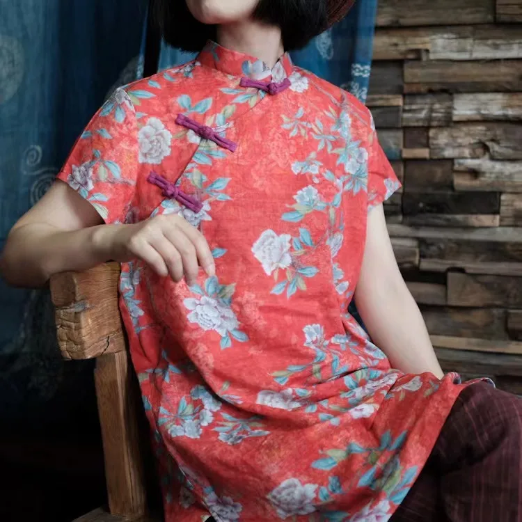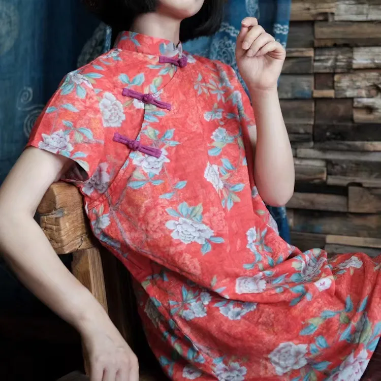 衣都精品- 新款數位印花中式旗袍拼色連衣裙