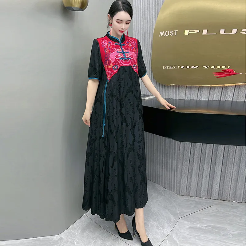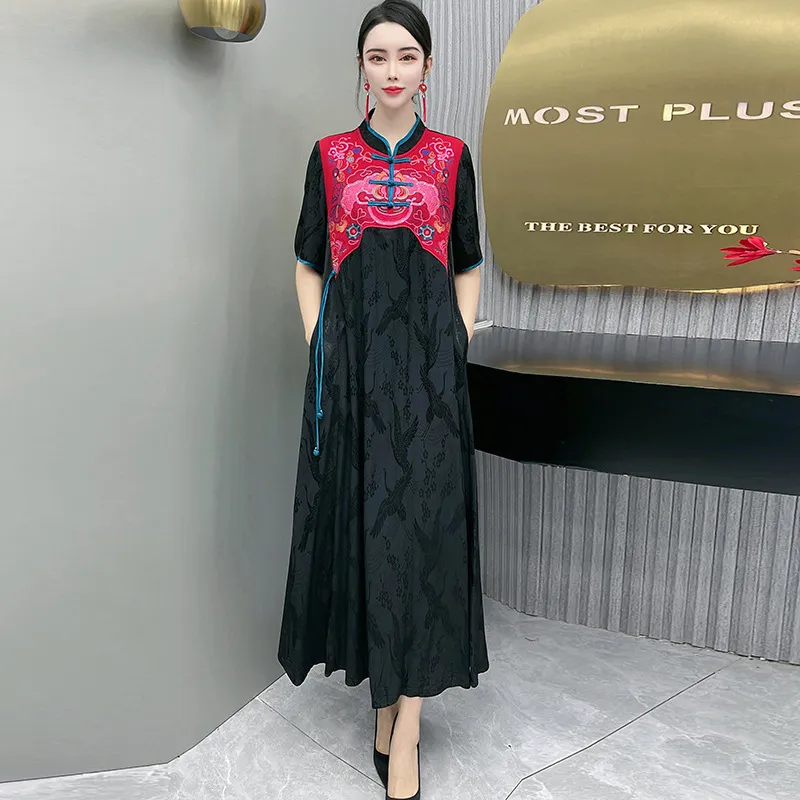 衣都精品- 新款民族風復古繡花長款立領大碼盤扣連衣裙