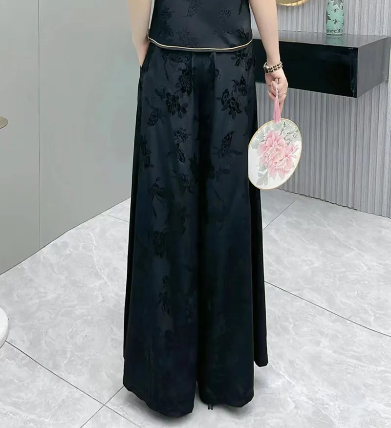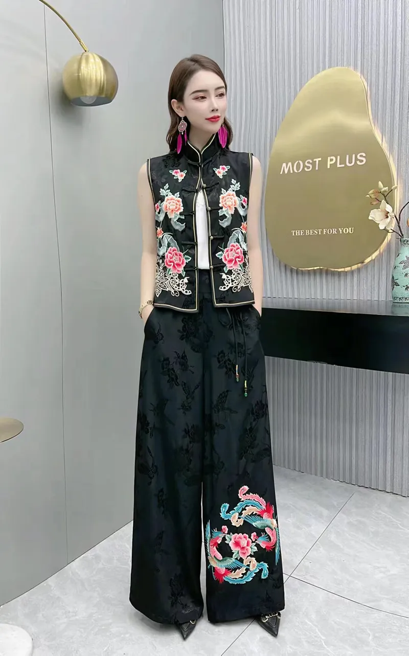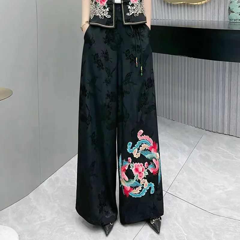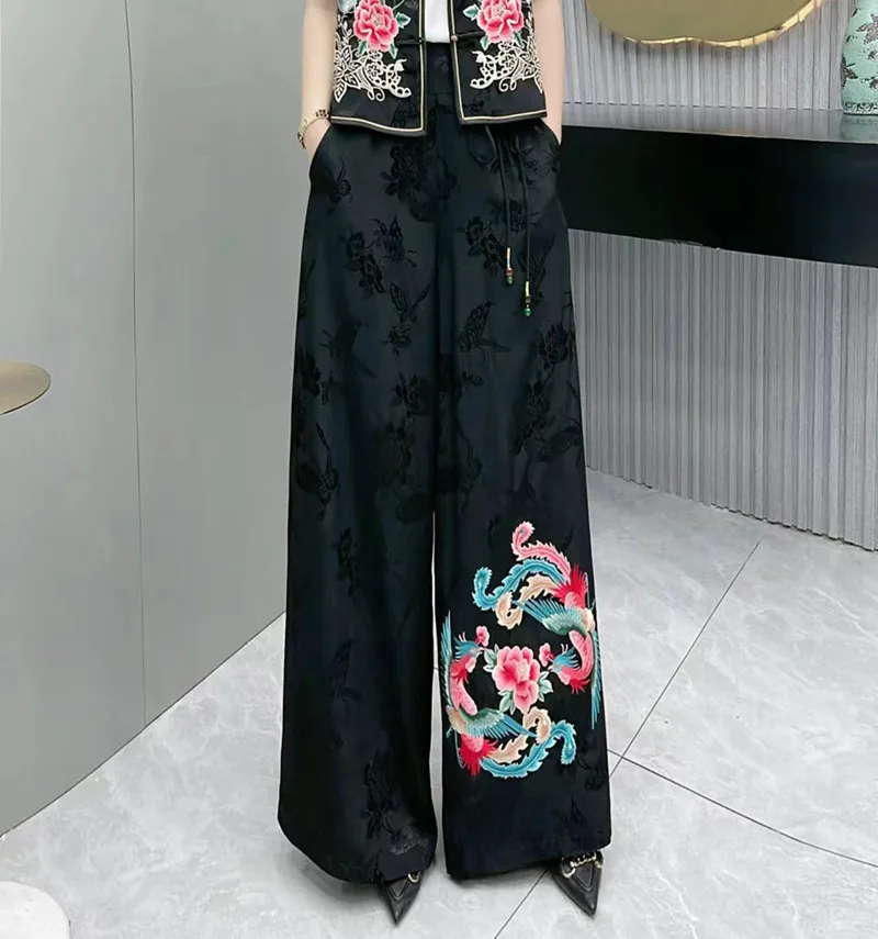 衣都精品- 2024新款民族風大碼鬆緊腰刺繡輕薄闊腿褲
