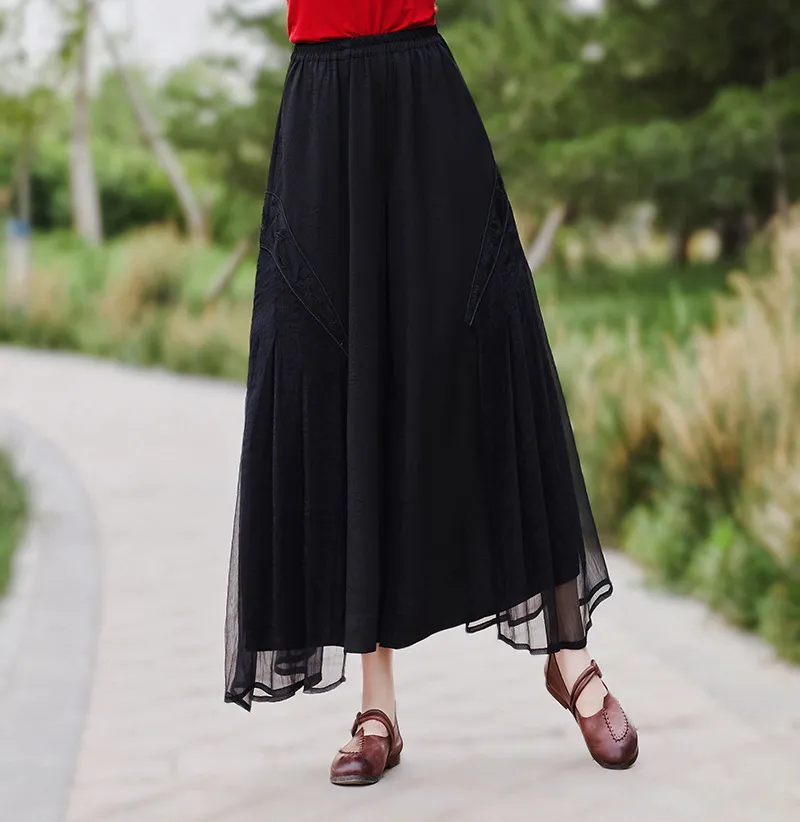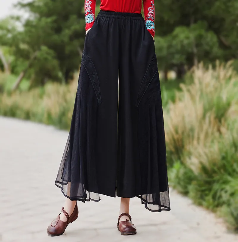 衣都精品- 2024新款民族風大碼鬆緊腰刺繡輕薄闊腿褲