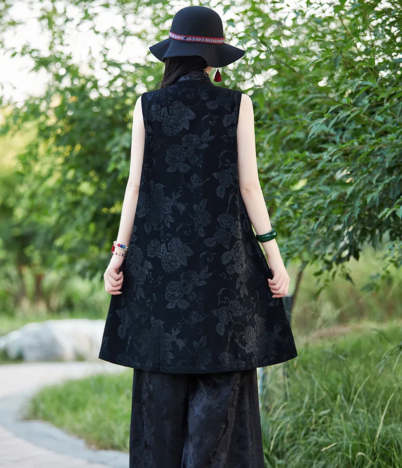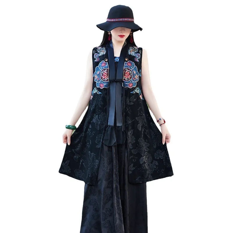 衣都精品- 新款民族風大碼復古繡花中式緞面長款馬甲