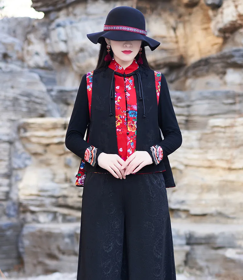 衣都精品- 新款民族風大碼復古繡花中式緞面長款馬甲