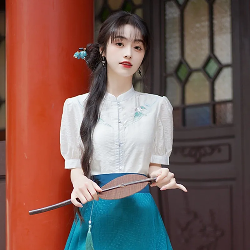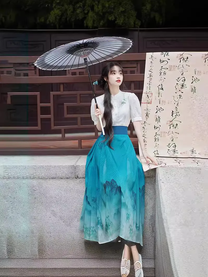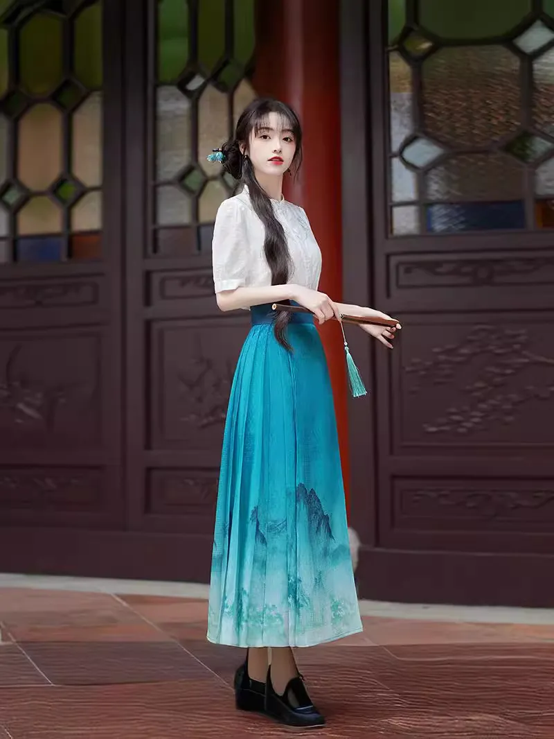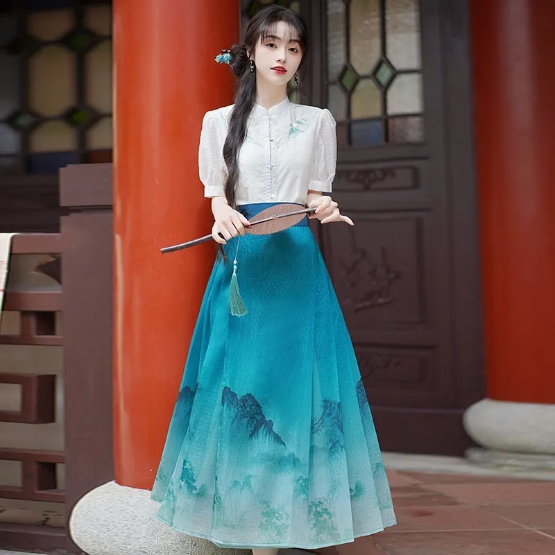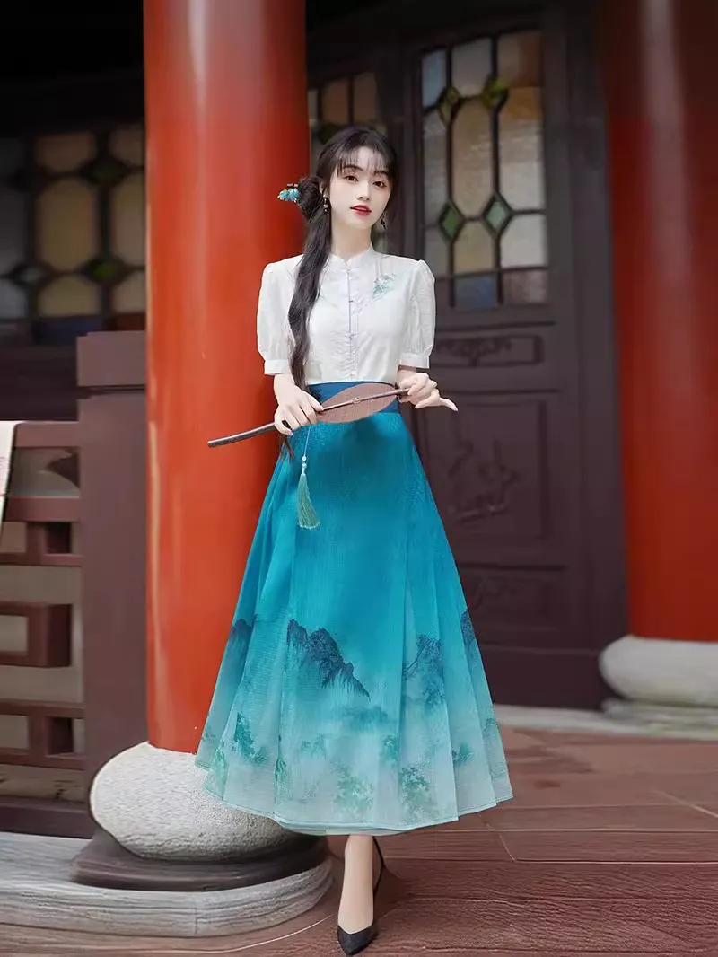 衣都精品- 新款民族風水墨漸層改良漢服上衣+馬面裙套裝