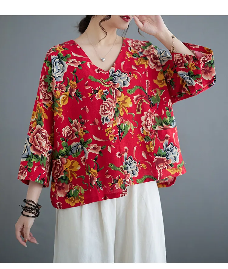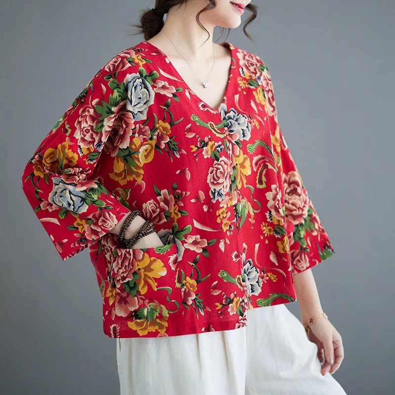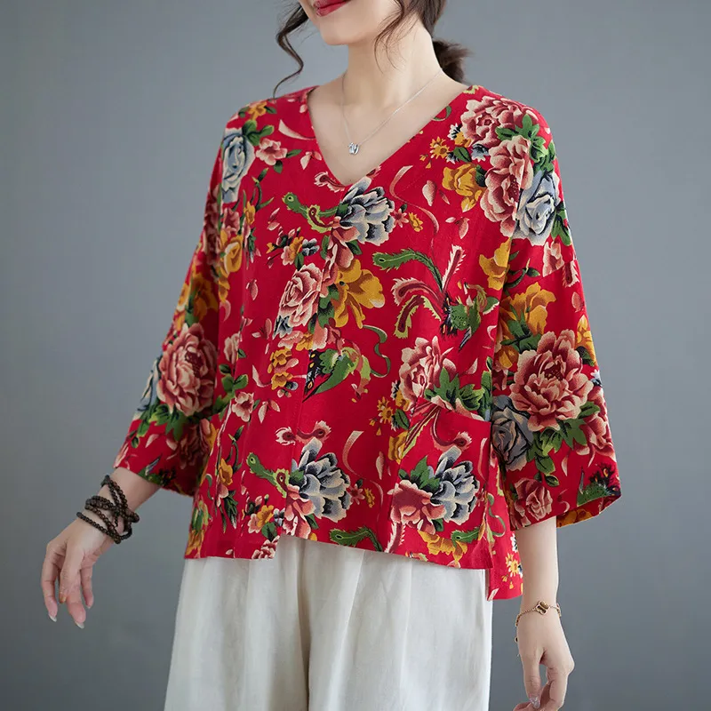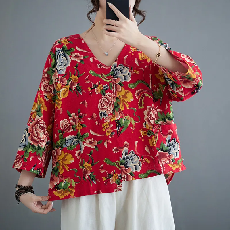 衣都精品- 新款復古東北大花V領不對稱寬鬆上衣