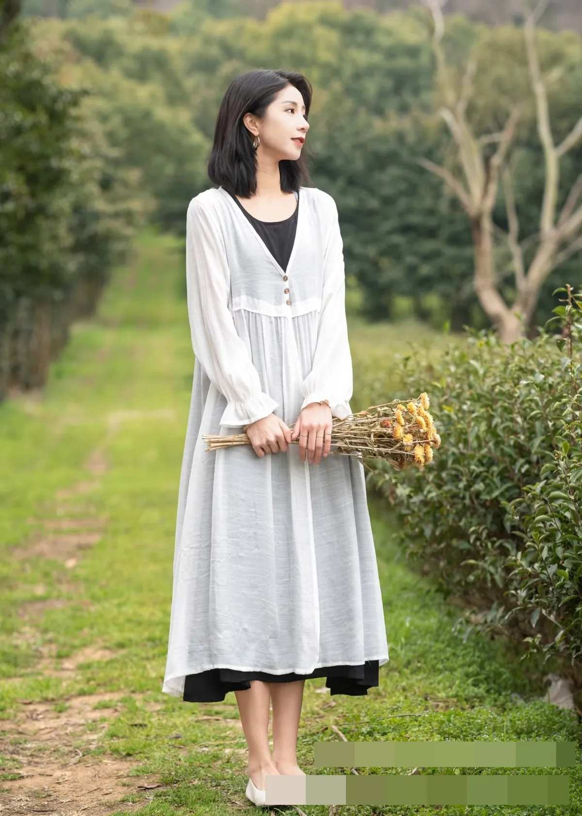 衣都精品- 新款純色大擺雙肩吊帶拼接文藝連衣裙