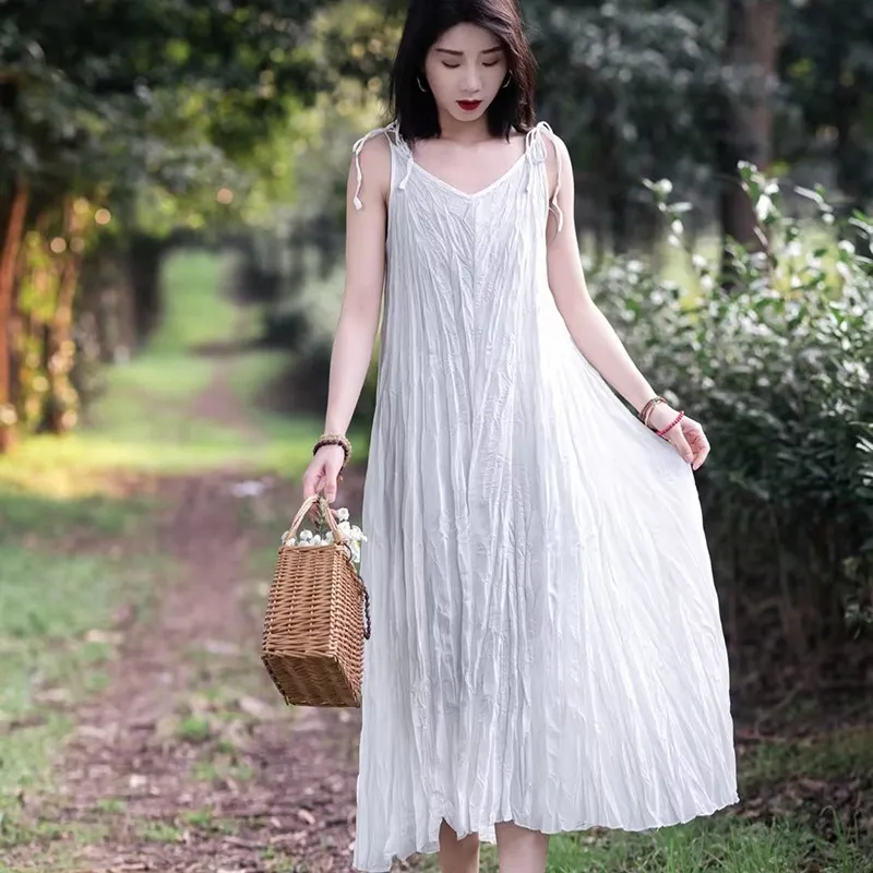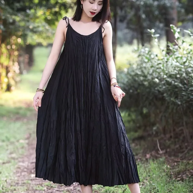 衣都精品- 新款文藝繫繩肩帶款純色壓皺連衣裙