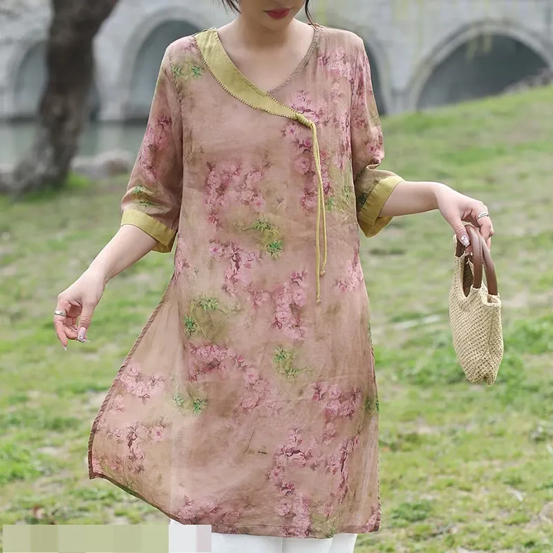 衣都精品- 新款民族風圓領牡丹中長款袍子斜襟上衣