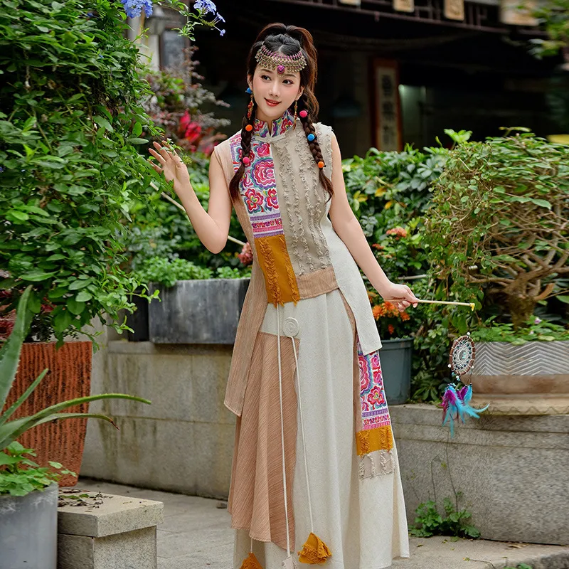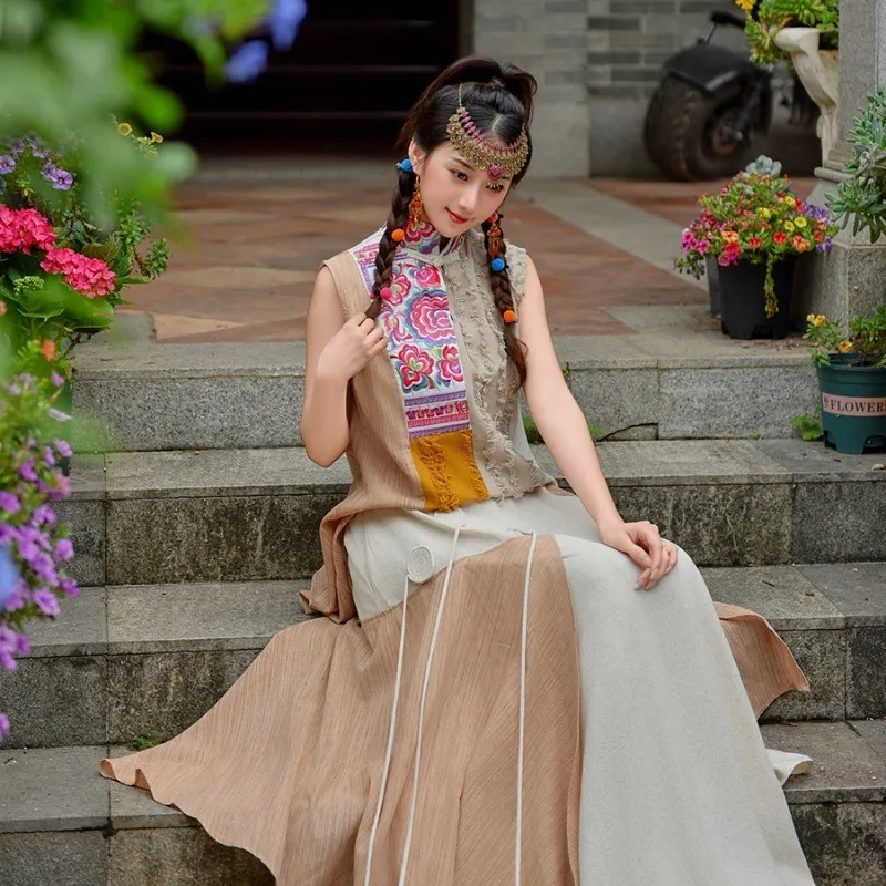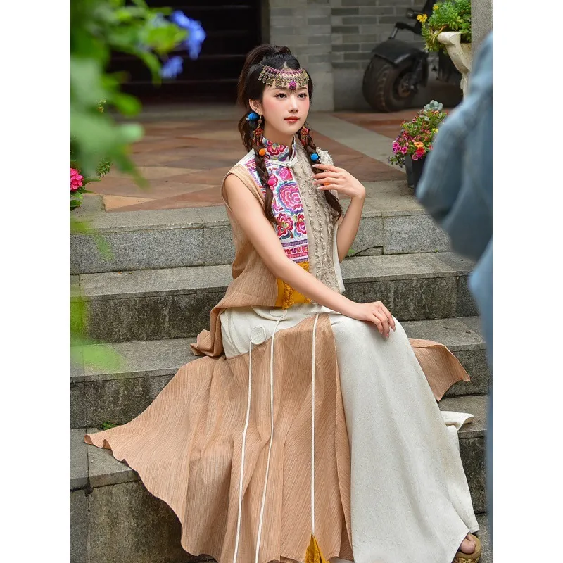 衣都精品- 新款復古風不規則無袖背心上衣+刺繡流蘇半身裙套裝