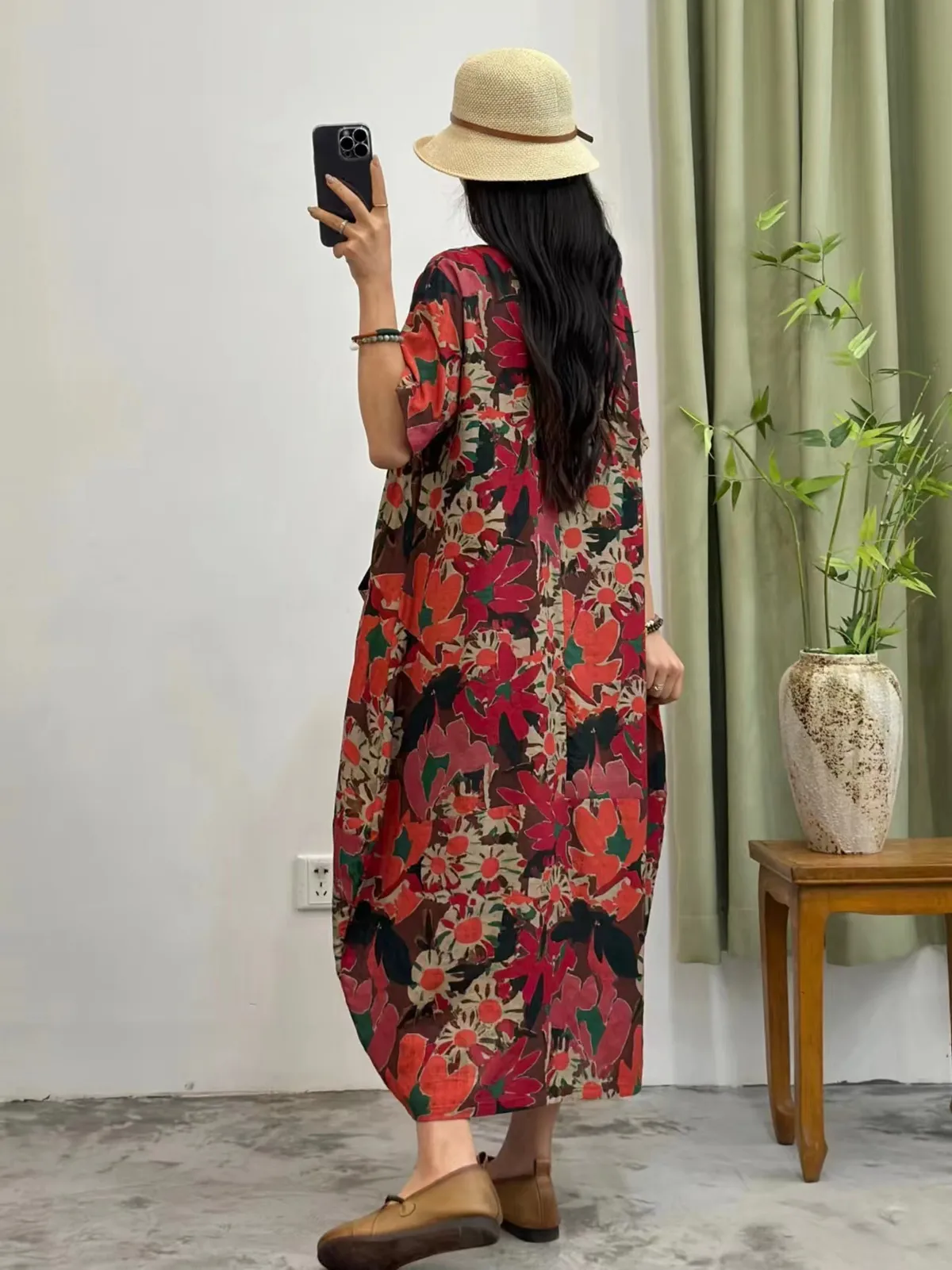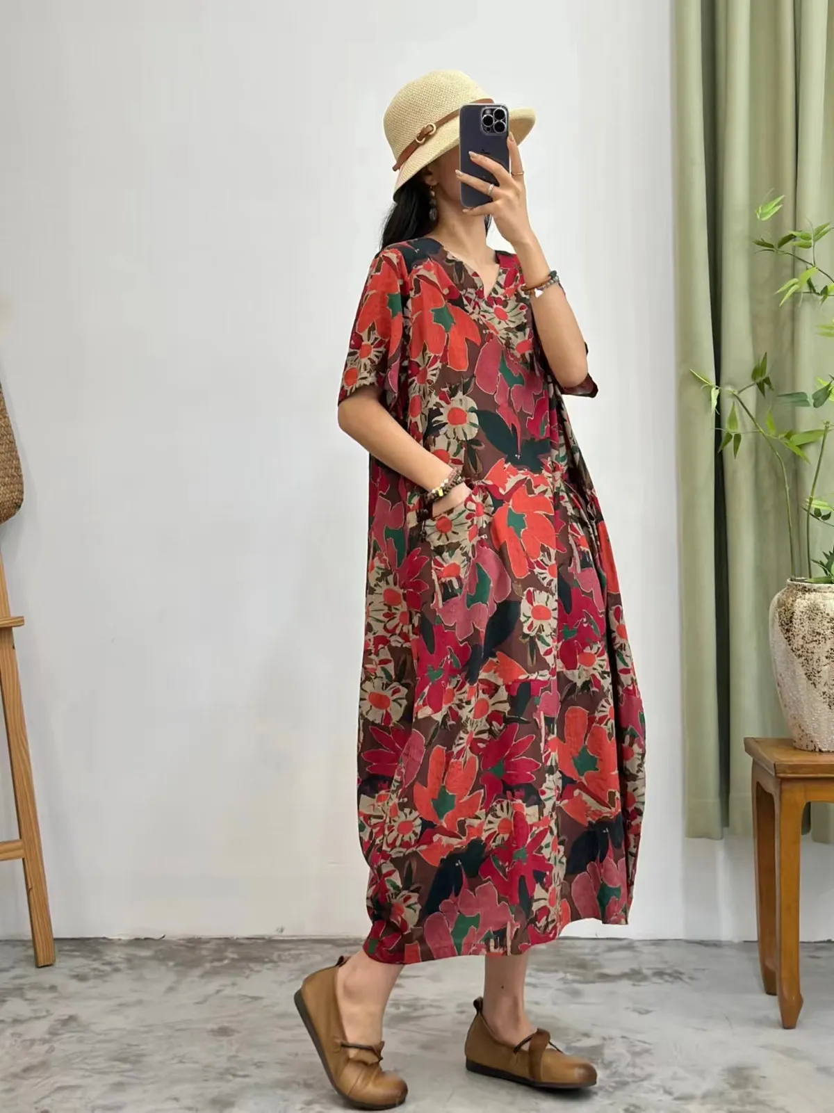 衣都精品- 新款民族風透氣舒適V領大碼短袖連衣裙