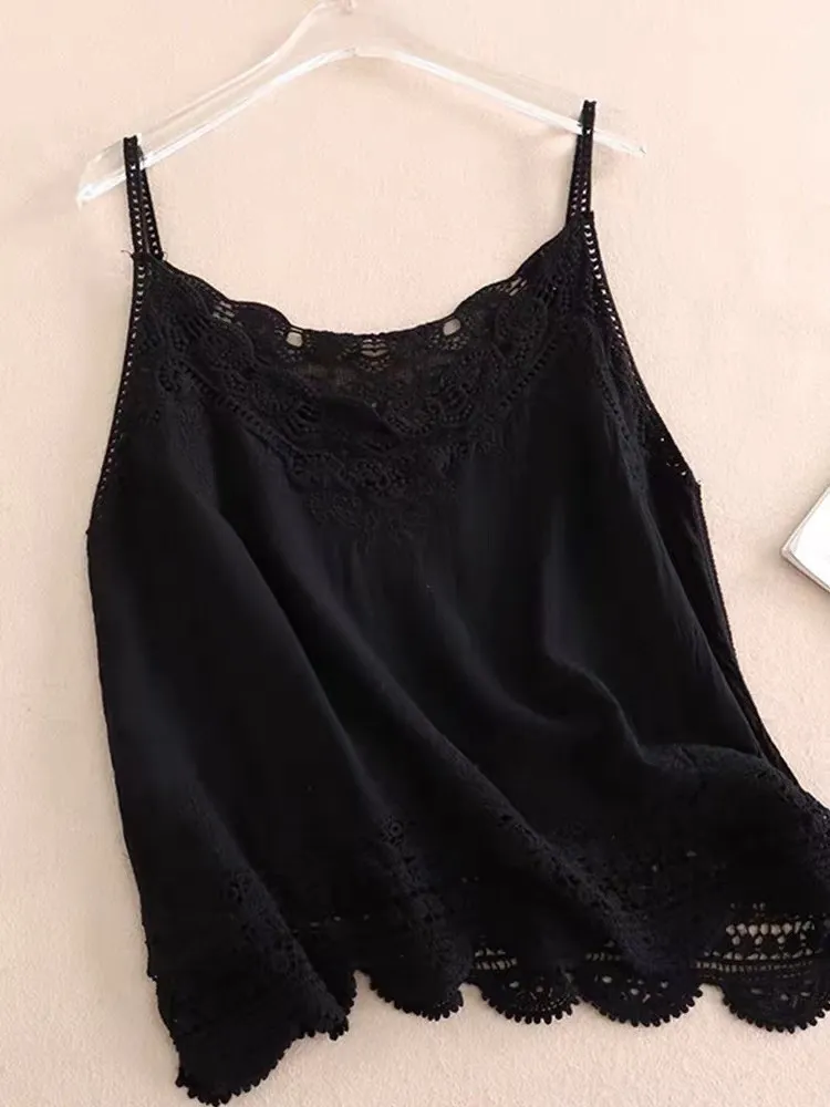 衣都精品- 新款棉麻拼接蕾絲花邊寬鬆小吊帶上衣