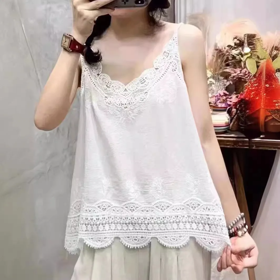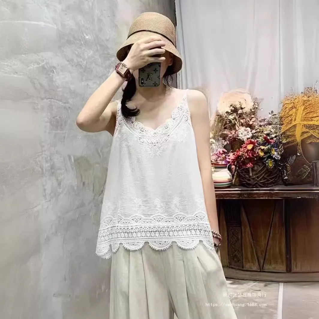 衣都精品- 新款棉麻拼接蕾絲花邊寬鬆小吊帶上衣