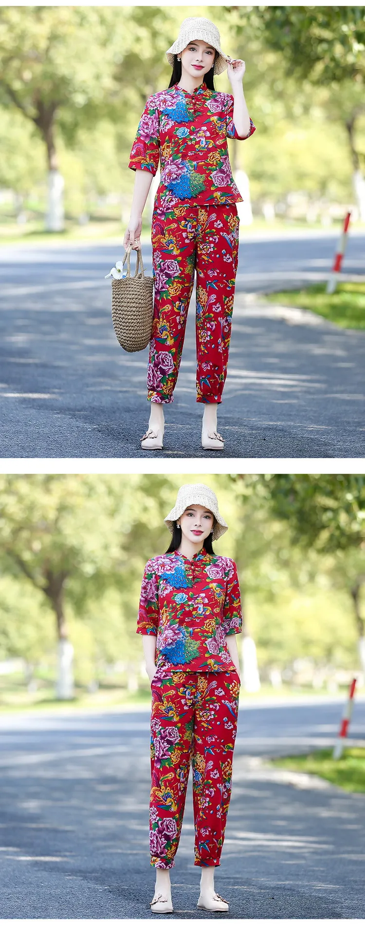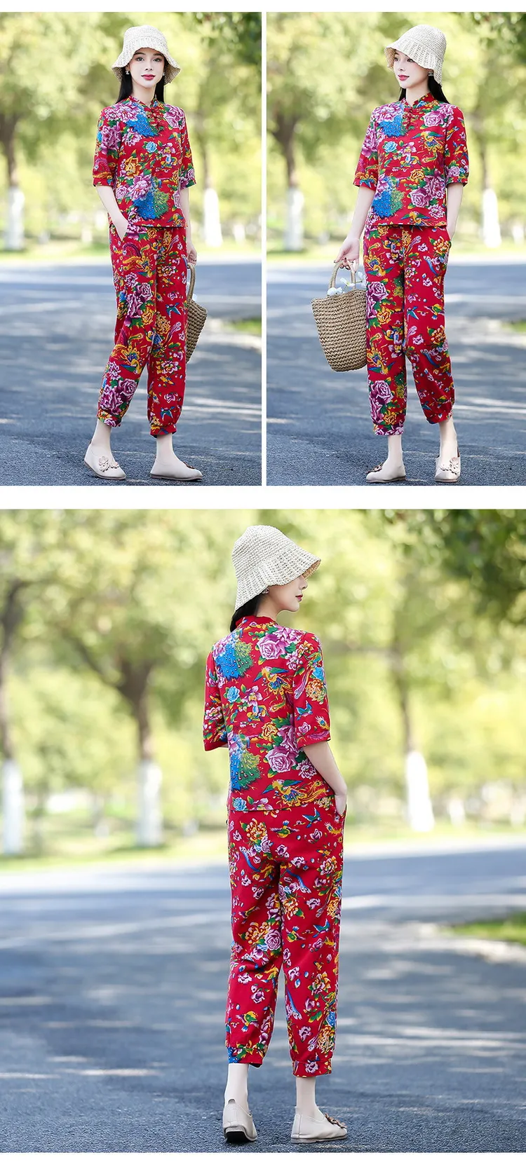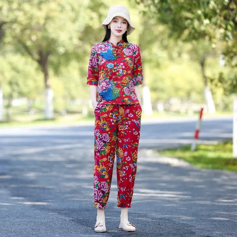 衣都精品- 新款東北大花民族風印花立領短袖上衣+鬆緊腰九分褲套裝