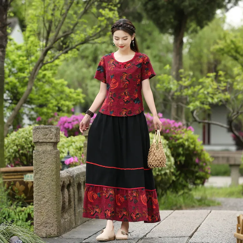 衣都精品- 新款民族風駿馬奔騰圓領短袖上衣+半身裙套裝