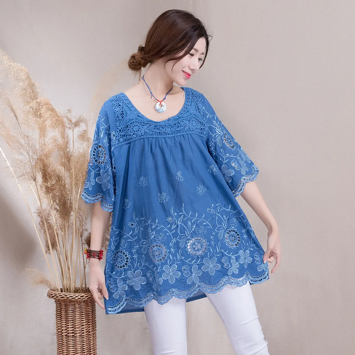衣都精品- 新款民族風鏤空寬鬆大碼中長款短袖上衣