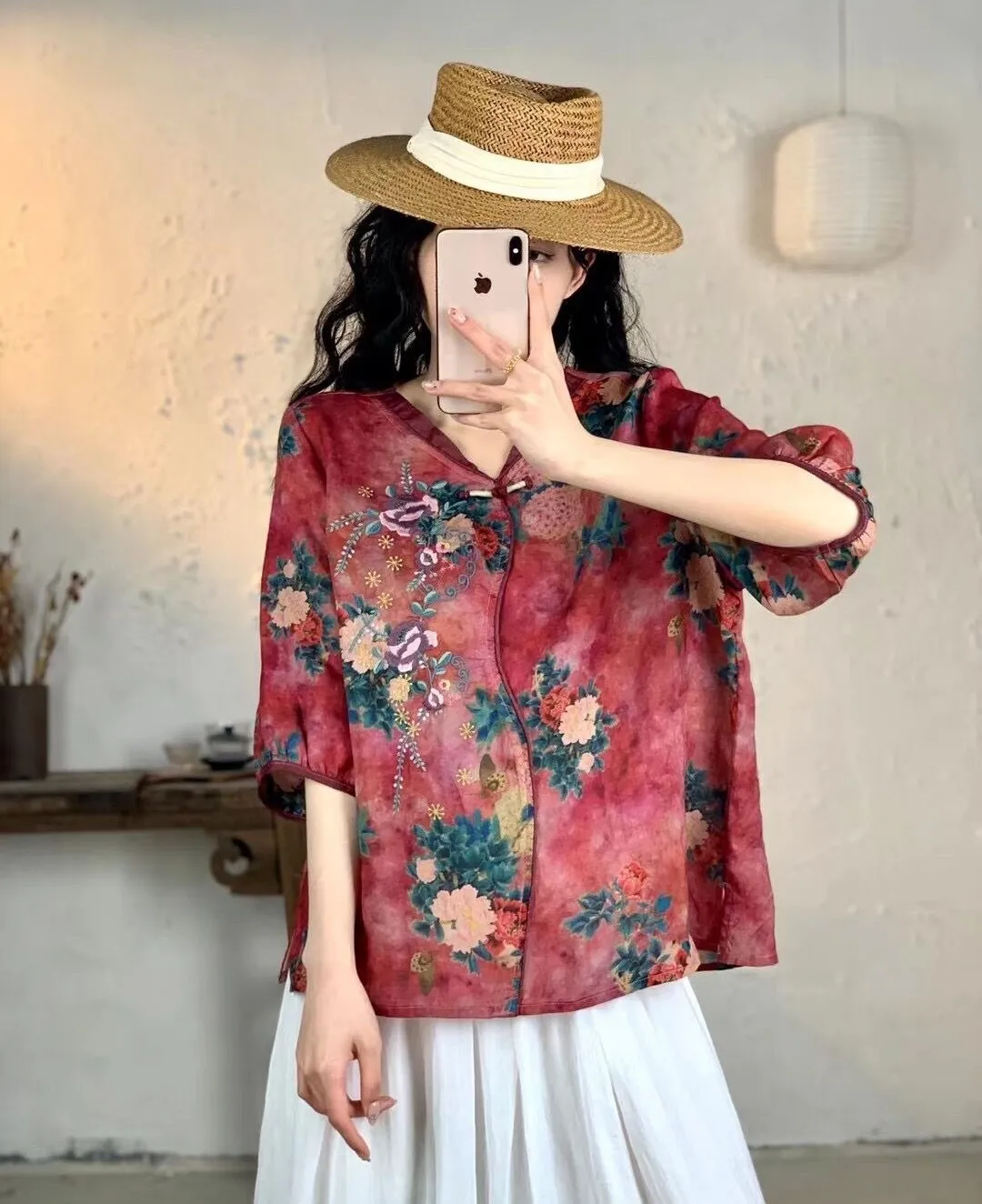 衣都精品- 新款民族風刺繡印花立領盤扣五分袖上衣