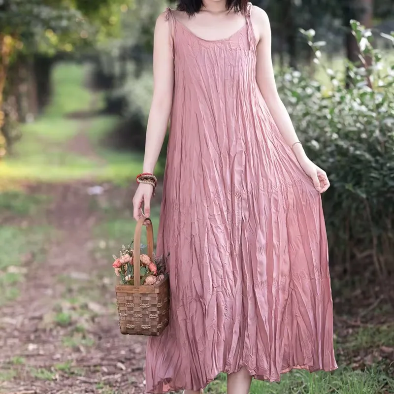 衣都精品- 新款文藝繫繩肩帶款純色壓皺連衣裙