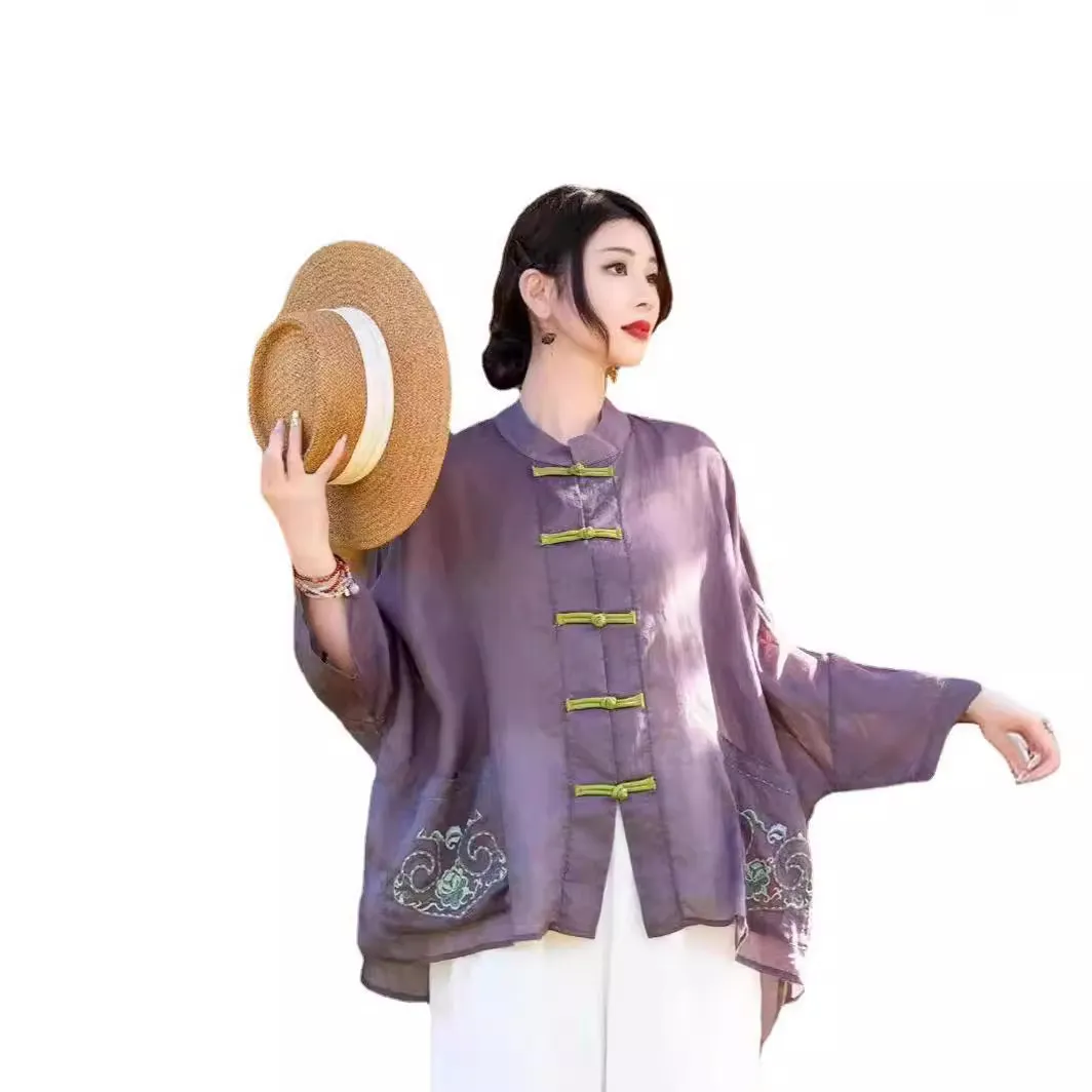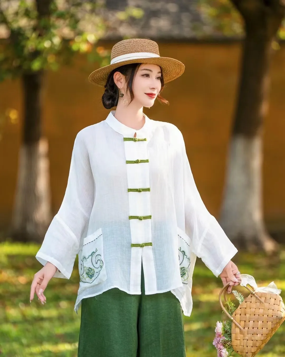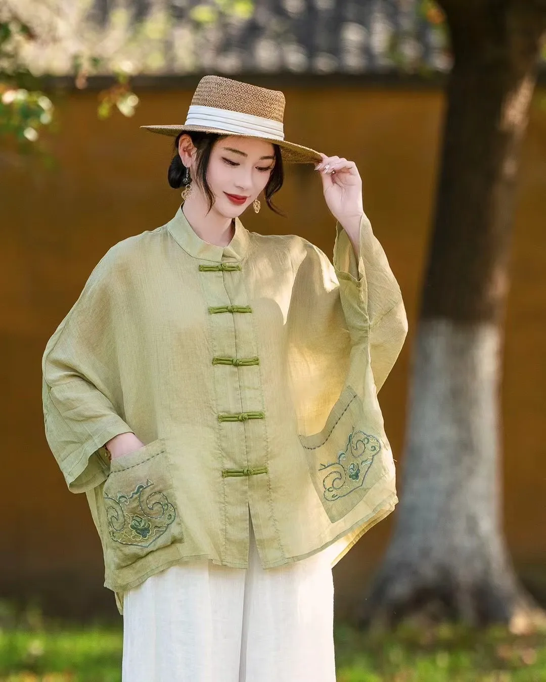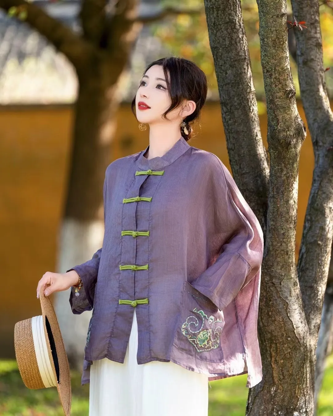 衣都精品- 新款文藝復古盤扣開襟衫刺繡撞色上衣