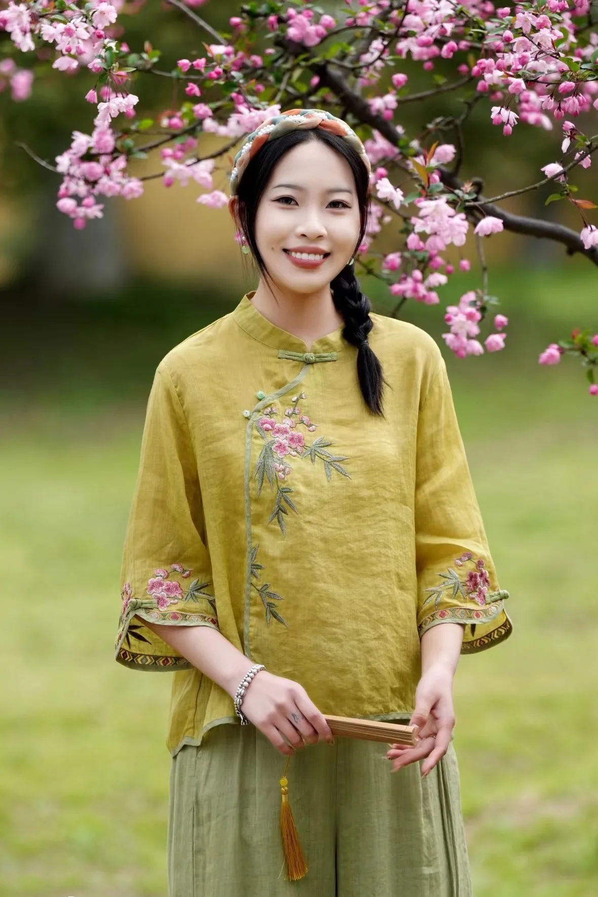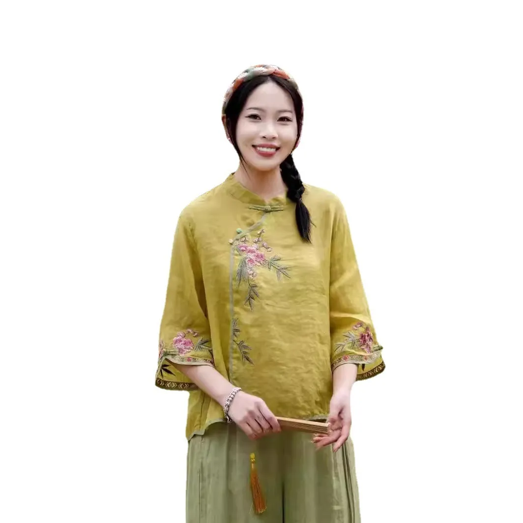 衣都精品- 新款文藝刺繡立領斜襟茶服七分袖上衣