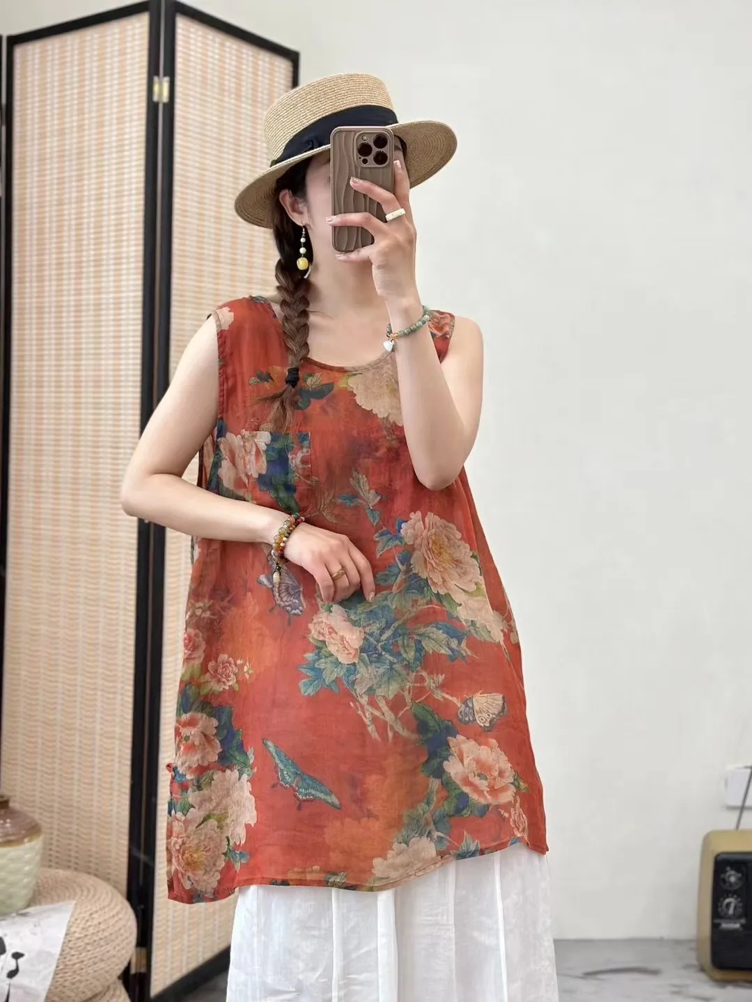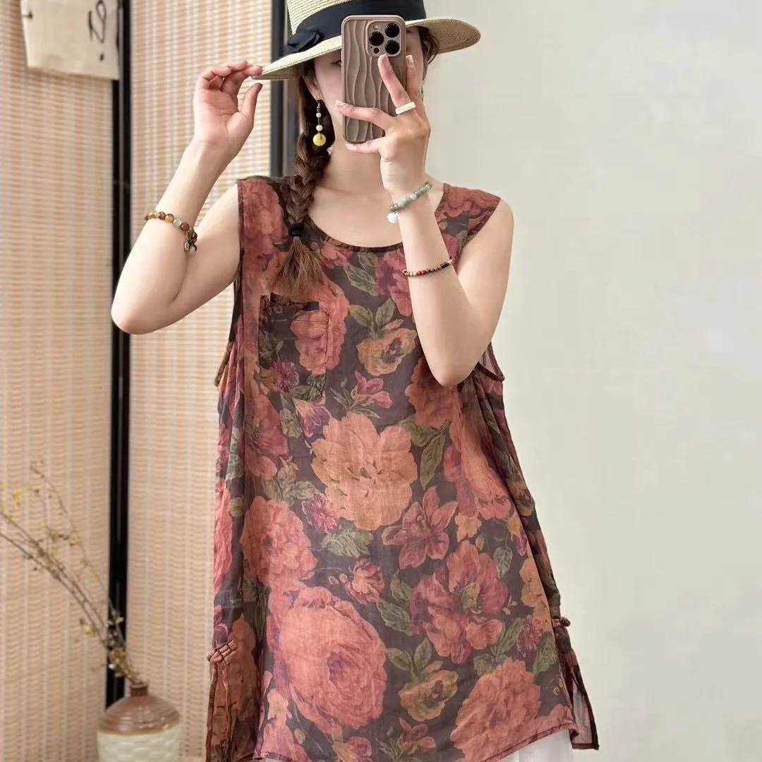 衣都精品- 新款文藝復古寬鬆圓領中長款背心上衣