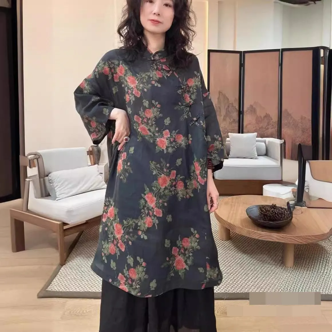 衣都精品- 新款民族風寬鬆印花立領碎花九分袖上衣
