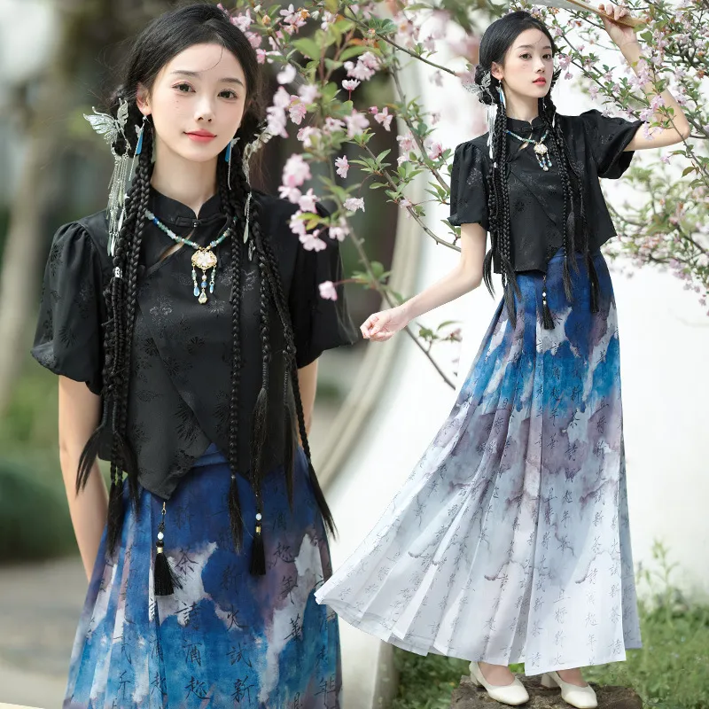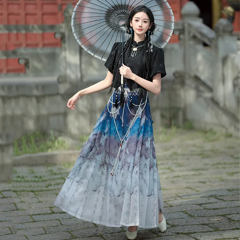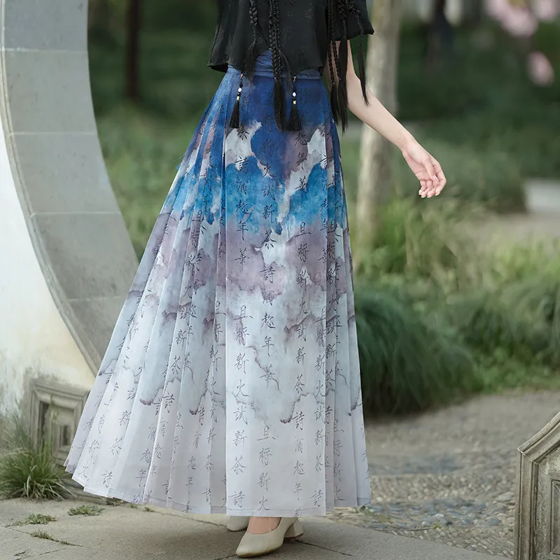 衣都精品- 新款民族風復古百褶一片式漸層印花馬面裙