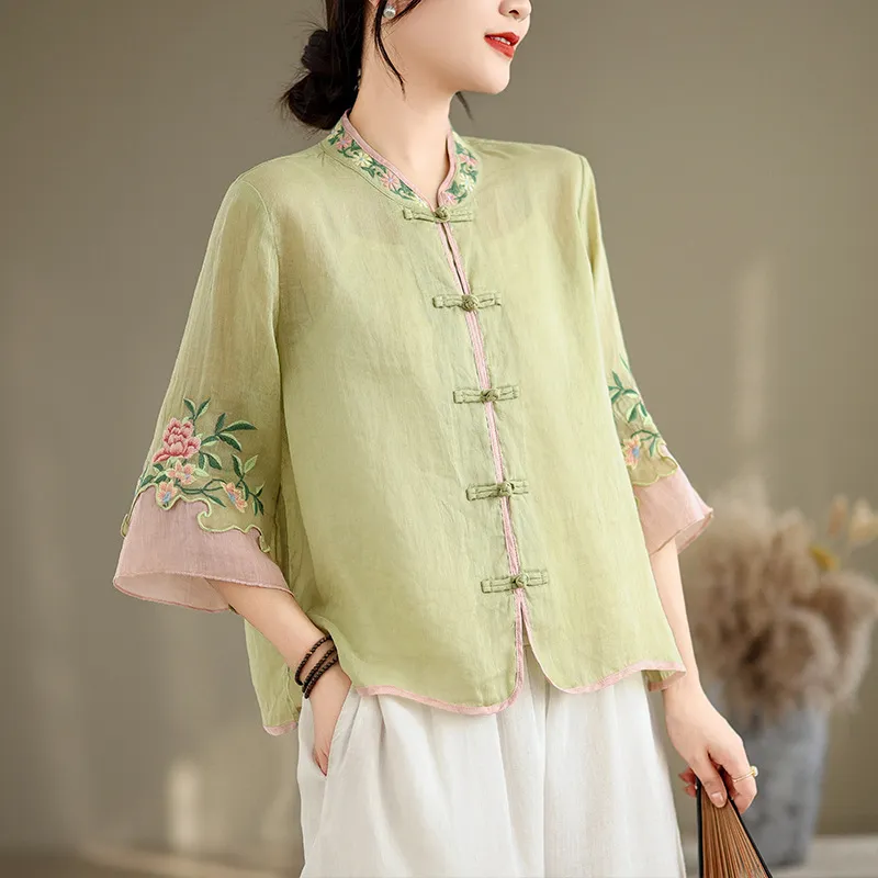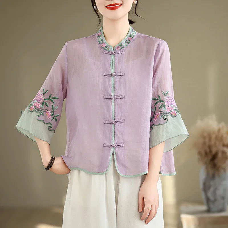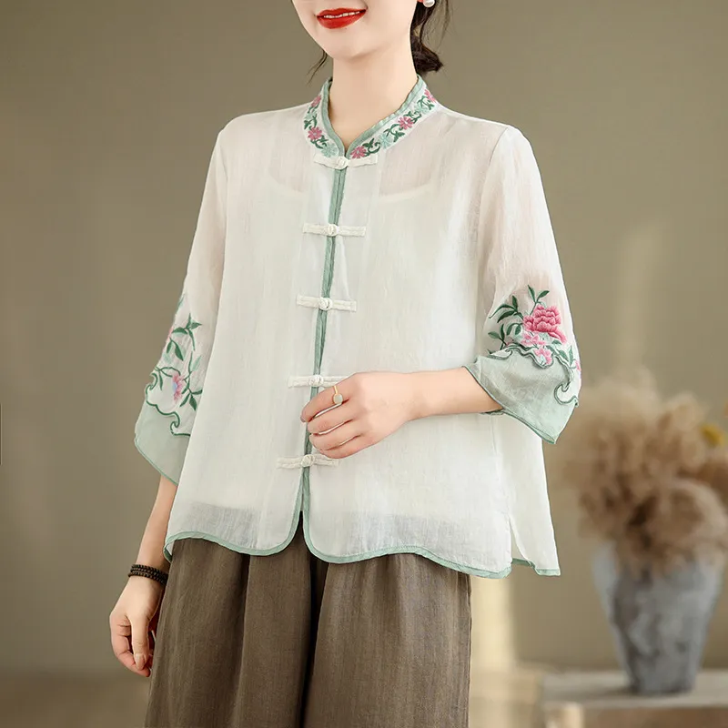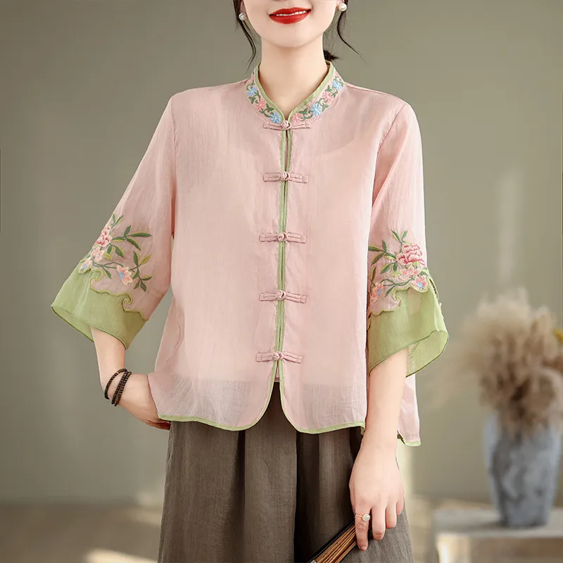 衣都精品- 新款重工刺繡盤扣寬鬆七分袖上衣
