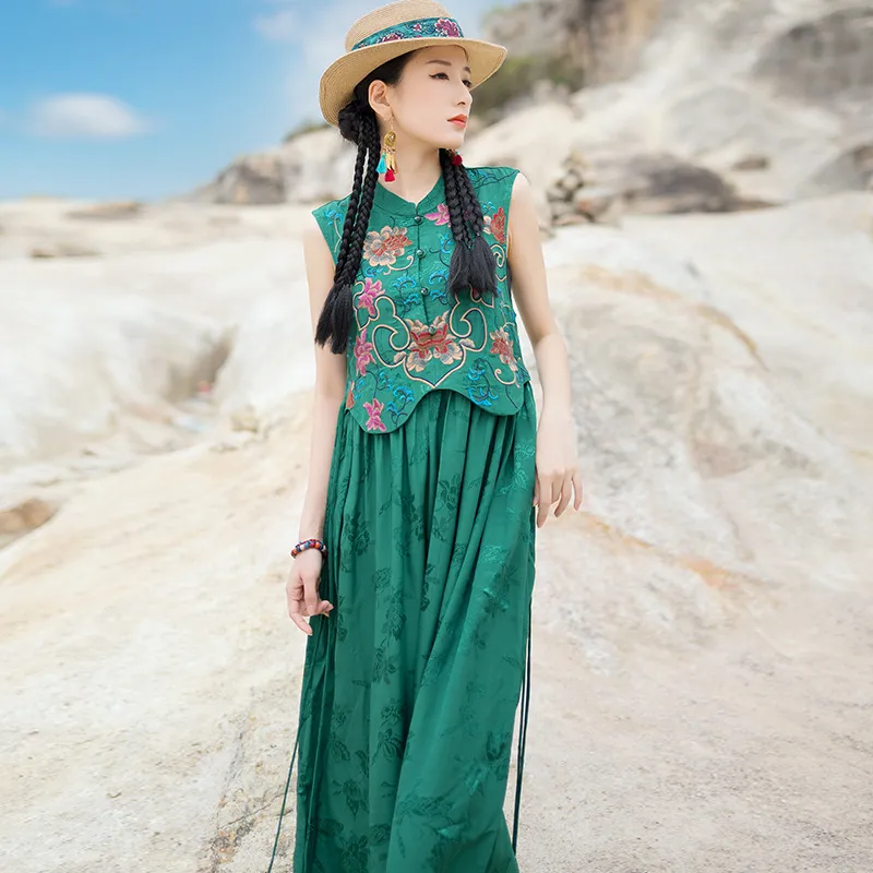 衣都精品- 新款民族風刺繡緞面提花無袖連衣裙
